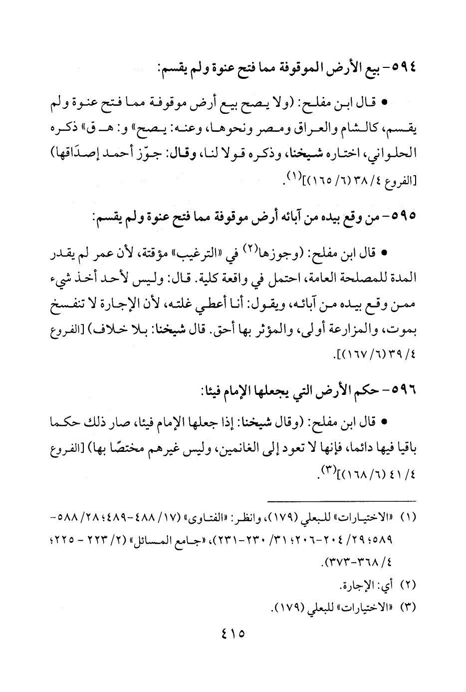 • قال ابن مفلح: (وقال شيخنا: إذا جعلها الإمام فيئا، صار ذلك حكما باقيا فيها دائما، فإنها لا تعود إلى الغانمين، وليس غيرهم مختصًا بها) [الفروع 4/ 41 (6/ 168)] (¬3).