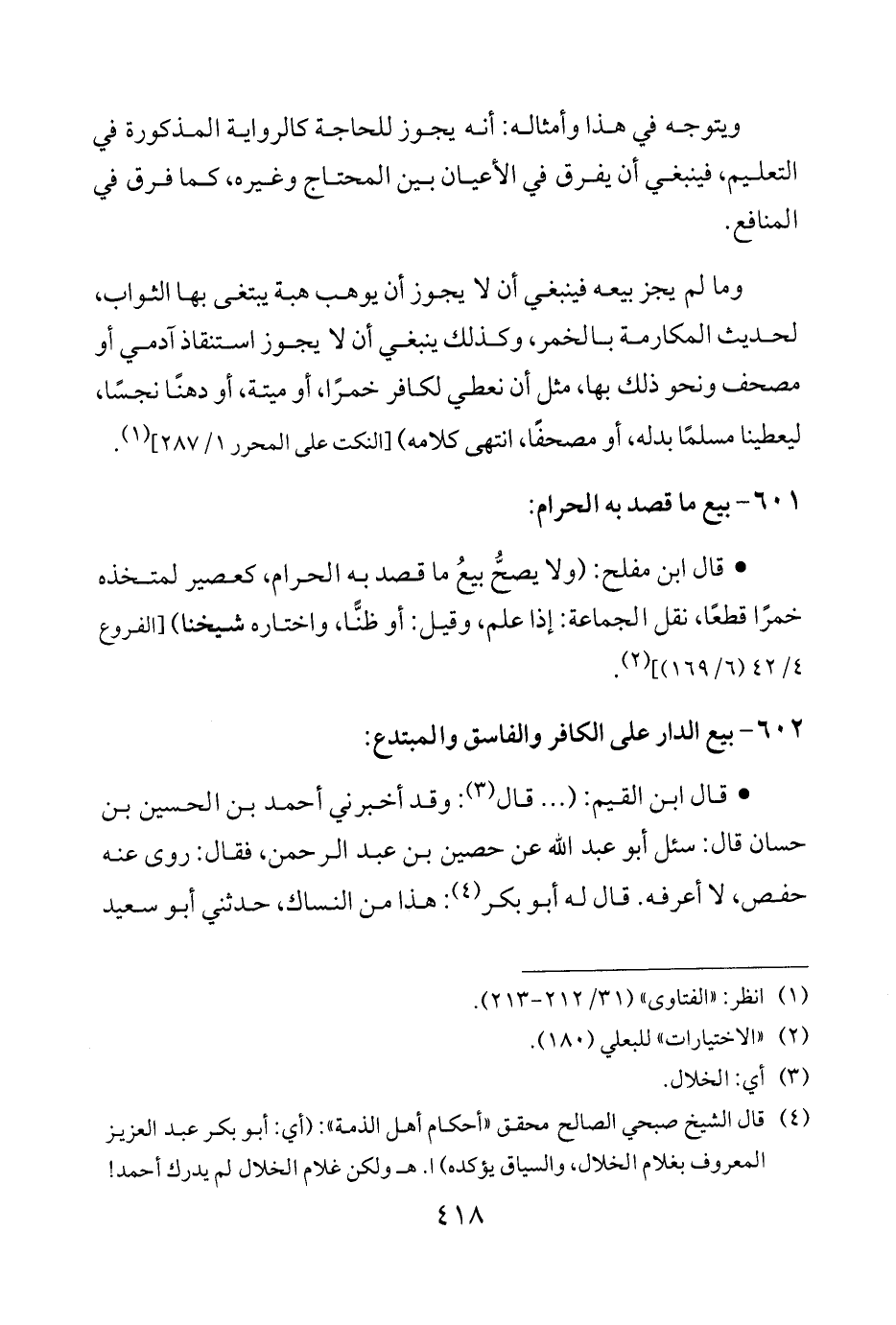 • قال ابن مفلح: (ولا يصحُّ بيعُ ما قصد به الحرام، كعصير لمتخذه خمرًا قطعًا، نقل الجماعة: إذا علم، وقيل: أو ظنًّا، واختاره شيخنا) [الفروع 4/ 42 (6/ 169)] (¬2).