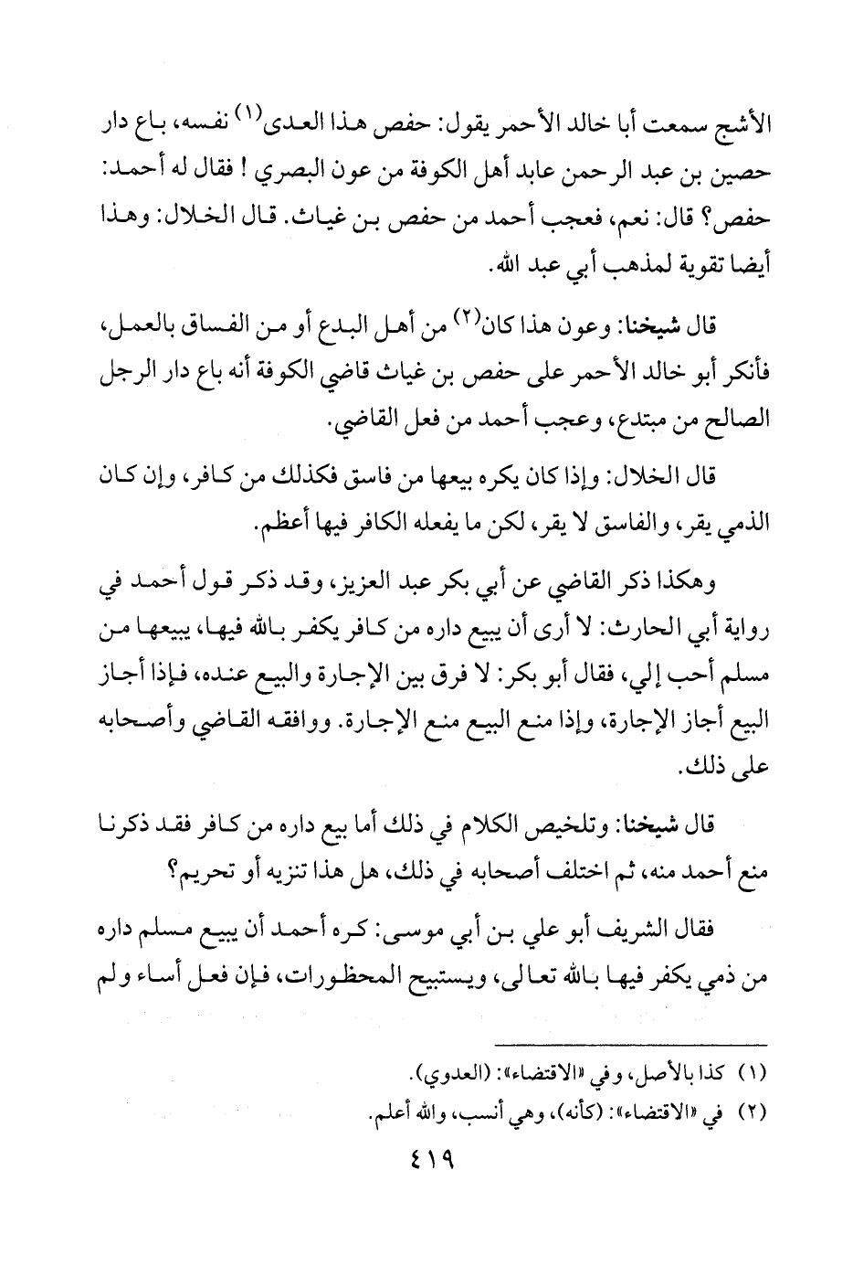 الأشج سمعت أبا خالد الأحمر يقول: حفص هذا العدى (¬1) نفسه، باع دار حصين بن عبد الرحمن عابد أهل الكوفة من عون البصري! فقال له أحمد: حفص؟ قال: نعم، فعجب أحمد من حفص بن غياث. قال الخلال: وهذا أيضًا تقوية لمذهب أبي عبد الله.