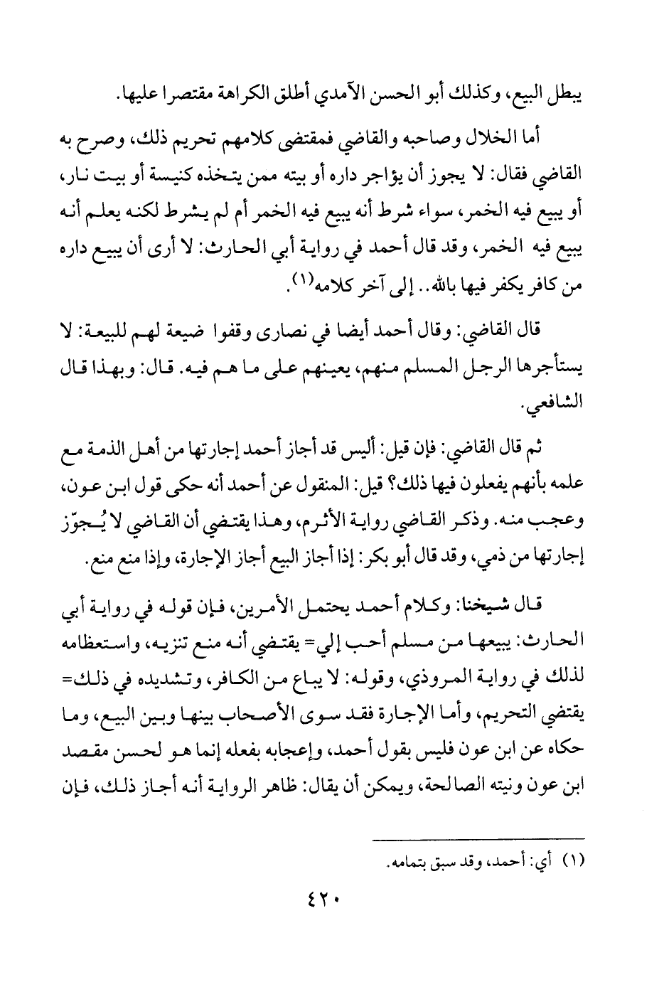 ثم قال القاضي: فإن قيل: أليس قد أجاز أحمد إجارتها من أهل الذمة مع علمه بأنهم يفعلون فيها ذلك؟ قيل: المنقول عن أحمد أنه حكى قول ابن عون، وعجب منه. وذكر القاضي رواية الأثرم، وهذا يقتضي أن القاضي لا يُجوّز إجارتها من ذمي، وقد قال أبو بكر: إذا أجاز البيع أجاز الإجارة، وإذا منع منع.