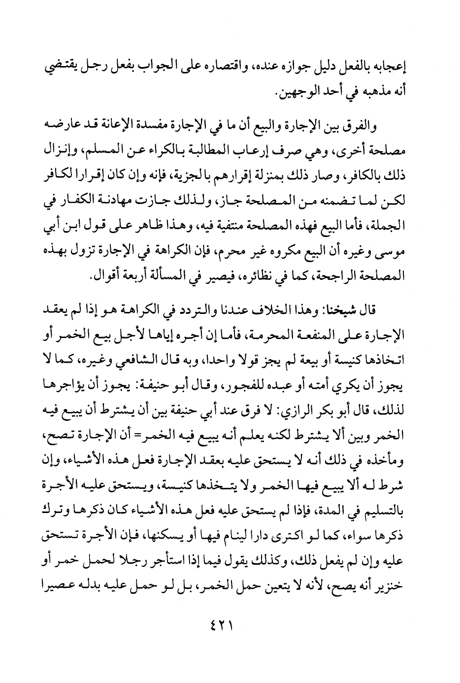 قال شيخنا: وهذا الخلاف عندنا والتردد في الكراهة هو إذا لم يعقد الإجارة على المنفعة المحرمة، فأما إن أجره إياها لأجل بيع الخمر أو اتخاذها كنيسة أو بيعة لم يجز قولا واحدا، وبه قال الشافعي وغيره، كما لا يجوز أن يكري أمته أو عبده للفجور، وقال أبو حنيفة: يجوز أن يؤاجرها لذلك، قال أبو بكر الرازي: لا فرق عند أبي حنيفة بين أن يشترط أن يبيع فيه الخمر وبين ألا يشترط لكنه يعلم أنه يبيع فيه الخمر = أن الإجارة تصح، ومأخذه في ذلك أنه لا يستحق عليه بعقد الإجارة فعل هذه الأشياء، وإن شرط له ألا يبيع فيها الخمر ولا يتخذها كنيسة، ويستحق عليه الأجرة بالتسليم في المدة، فإذا لم يستحق عليه فعل هذه الأشياء كان ذكرها وترك ذكرها سواء، كما لو اكترى دارا لينام فيها أو يسكنيها، فإن الأجرة تستحق عليه وإن لم يفعل ذلك، وكذلك يقول فيما إذا استأجر رجلا لحمل خمر أو خنزير أنه يصح، لأنه لا يتعيق حمل الخمر، بل لو حمل عليه بدله عصيرا