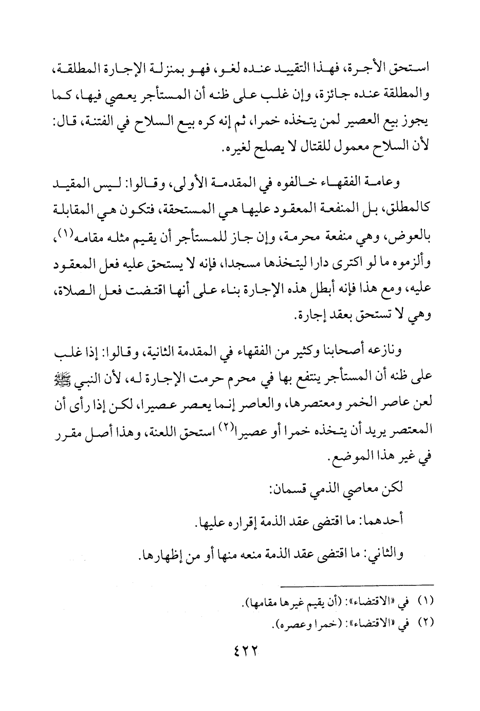 ونازعه أصحابنا وكثير من الفقهاء في المقدمة الثانية، وقالوا: إذا غلب على ظنه أن المستأجر ينتفع بها في محرم حرمت الإجارة له، لأن النبي - صلى الله عليه وسلم - لعن عاصر الخمر ومعتصرها، والعاصر إنما يعصر عصيرا، لكن إذا رأى أن المعتصر يريد أن يتخذه خمرا أو عصيرا (¬2) استحق اللعنة، وهذا أصل مقرر في غير هذا الموضع.