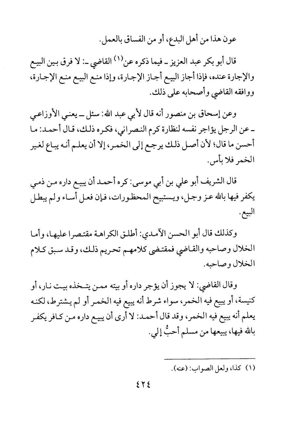 وقال القاضي: لا يجوز أن يؤجر داره أو بيته ممن يتخذه بيت نار، أو كنيسة، أو يبيع فيه الخمر، سواء شرط أنه يبيع فيه الخمر أو لم يشترط، لكنه يعلم أنه يبيع فيه الخمر، وقد قال أحمد: لا أرى أن يبيع داره من كافر يكفر بالله فيها، يبيعها من مسلم أحبُّ إلي.