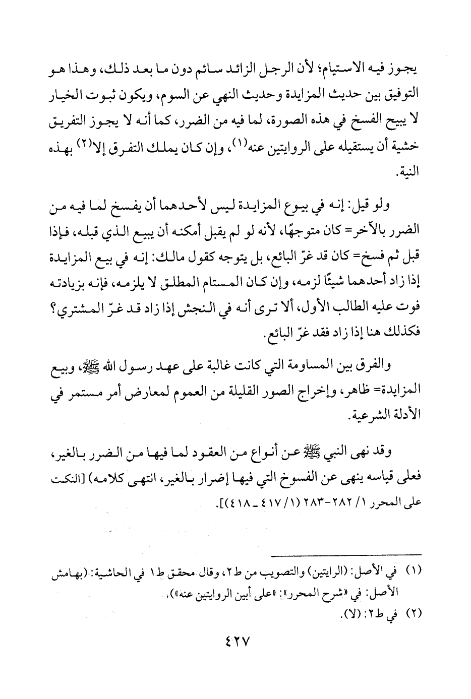 ولو قيل: إنه في بيوع المزايدة ليس لأحدهما أن يفسخ لما فيه من الضرر بالآخر = كان متوجهًا، لأنه لو لم يقبل أمكنه أن يبيع الذي قبله، فإذا قبل ثم فسخ = كان قد غرّ البائع، بل يتوجه كقول مالك: إنه في بيع المزايدة إذا زاد أحدهما شيئًا لزمه، وإن كان المستام المطلق لا يلزمه، فإنه بزيادته فوت عليه الطالب الأول، ألا ترى أنه في النجش إذا زاد قد غرّ المشتري؟ فكذلك هنا إذا زاد فقد غرّ البائع.