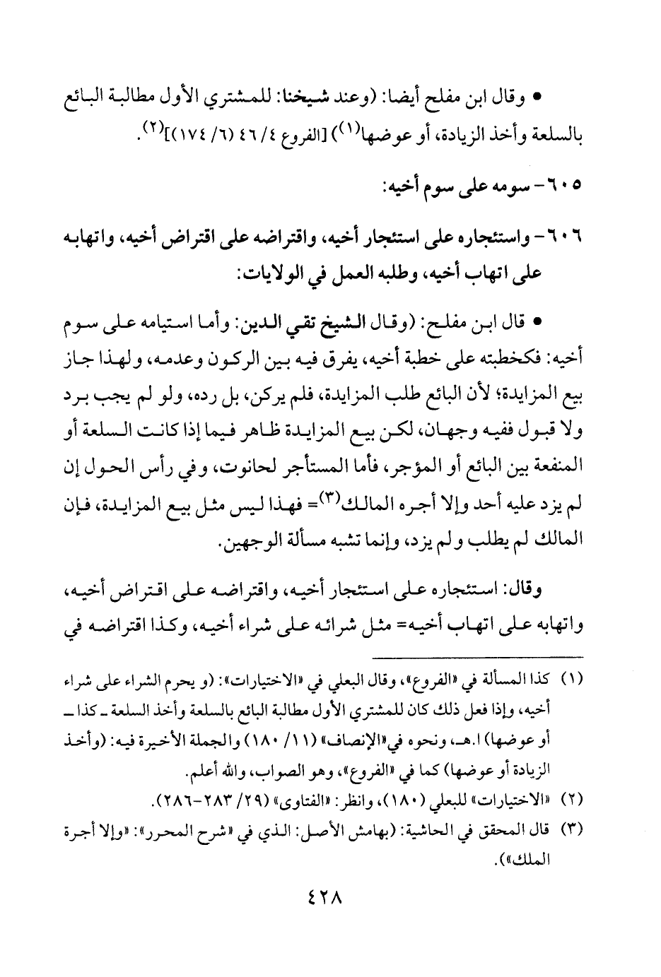 (¬1) كذا المسألة في "الفروع"، وقال البعني في "الاختيارات": (ويحرم الشراء على شراء أخيه، وإذا فعل ذلك كان للمشتري الأول مطالبة البائع بالسلعة وأخذ السلعة -كذا- أو عوضها) ا. هـ، ونحوه في "الإنصاف" (11/ 180) والجملة الأخيرة فيه: (وأخذ الزيادة أو عوضها) كما في "الفروع"، وهو الصواب، والله أعلم.