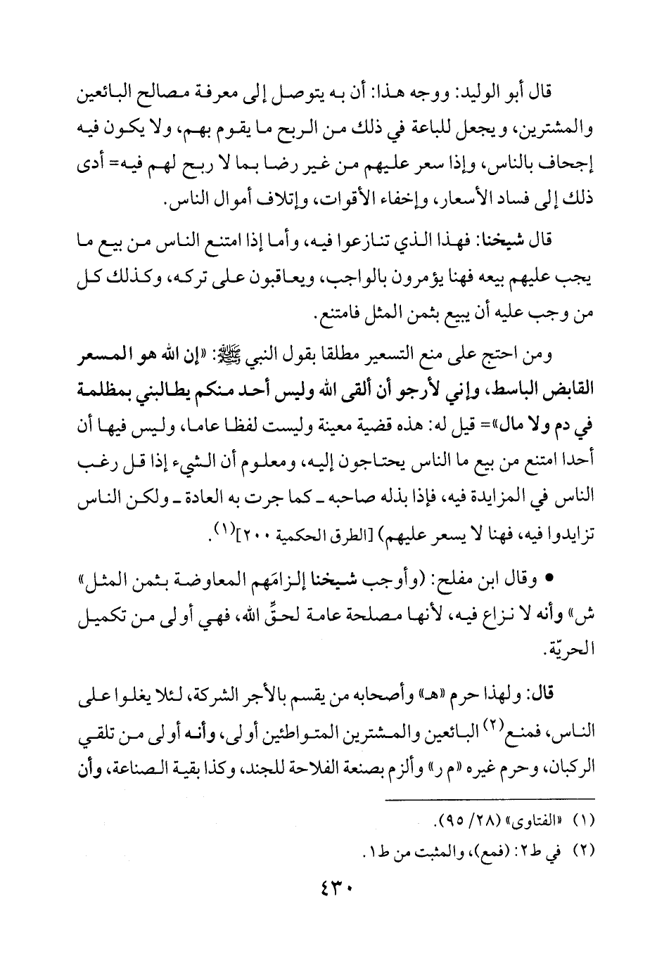 ومن احتج على منع التسعير مطلقا بقول النبي - صلى الله عليه وسلم -: "إن الله هو المسعر القابض الباسط، وإني لأرجو أن ألقى الله وليس أحد منكم يطالبني بمظلمة في دم ولا مال" = قيل له: هذه قضية معينة وليست لفظا عاما، وليس فيها أن أحدا امتنع من بيع ما الناس يحتاجون إليه، ومعلوم أن الشيء إذا قل رغب الناس في المزايدة فيه، فإذا بذله صاحبه -كما جرت به العادة- ولكن الناس تزايدوا فيه، فهنا لا يسعر عليهم) [الطرق الحكمية 200] (¬1).