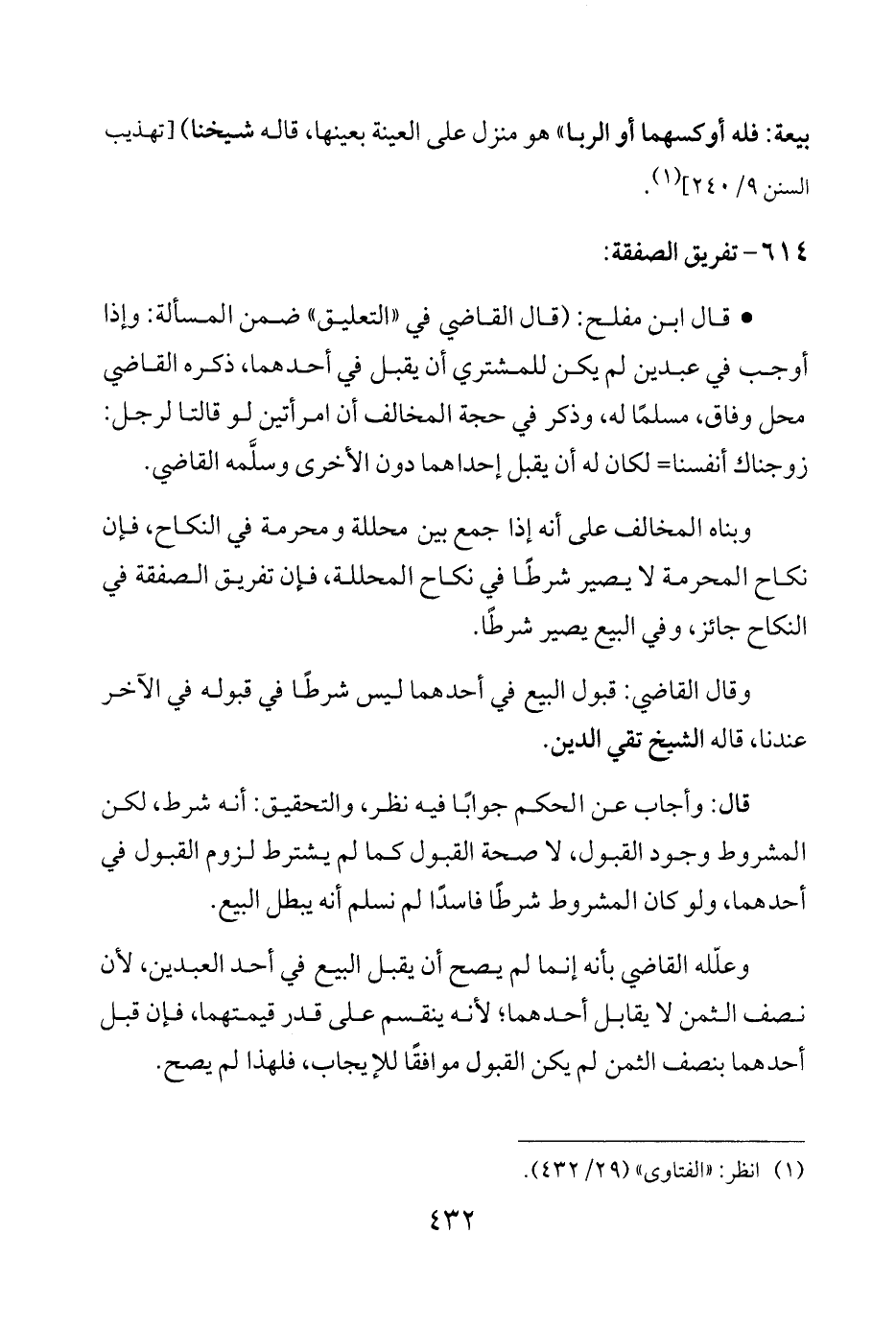 • قال ابن مفلح: (قال القاضي في "التعليق" ضمن المسألة: وإذا أوجب في عبدين لم يكن للمشتري أن يقبل في أحدهما، ذكره القاضي محل وفاق، مسلمًا له، وذكر في حجة المخالف أن امرأتين لو قالتا لرجل: زوجناك أنفسنا = لكان له أن يقبل إحداهما دون الأخرى وسلَّمه القاضي.