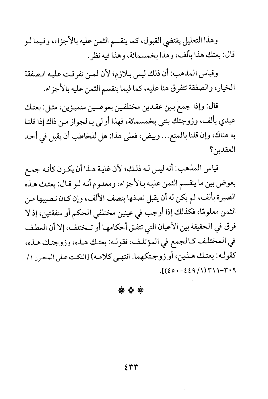 قياس المذهب: أنه ليس له ذلك؛ لأن غاية هذا أن يكون كأنه جمع بعوض بين ما ينقسم الثمن عليه بالأجزاء، ومعلوم أنه لو قال: بعتك هذه الصبرة بألف، لم يكن له أن يقبل نصفها بنصف الألف، وإن كان نصيبها من الثمن معلومًا، فكذلك إذا أوجب في عينين مختلفي الحكم أو متفقتين، إذ لا فرق في الحقيقة بين الأعيان التي تتفق أحكامها أو تخاتلف، إلا أن العطف في المختلف كالجمع في المؤتلف، فقوله: بعتك هذه، وزوجتك هذه، كقوله: بعتك هذين، أو زوجتكهما. انتهى كلامه) [النكت على المحرر 1/ 309 - 311 (449 - 450)].