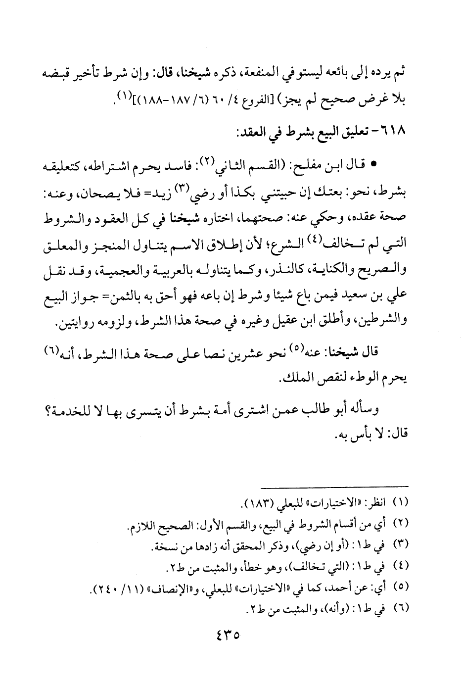 • قال ابن مفلح: (القسم الثاني (¬2): فاسد يحرم اشتراطه، كتعليقه بشرط، نحو: بعتك إن حبيتني بكذا أو رضي (¬3) زيد = فلا يصحان، وعنه: صحة عقده، وحكي عنه: صحتهما، اختاره شيخنا في كل العقود والشروط التي لم تخالف (¬4) الشرع؛ لأن إطلاق الاسم يتناول المنجز والمعلق والصريح والكناية، كالنذر، وكما يتناوله بالعربية والعجمية، وقد نقل علي بن سعيد فيمن باع شيئًا وشرط إن باعه فهو أحق به بالثمن = جواز البيع والشرطين، وأطلق ابن عقيل وغيره في صحة هذا الشرط، ولزومه روايتين.