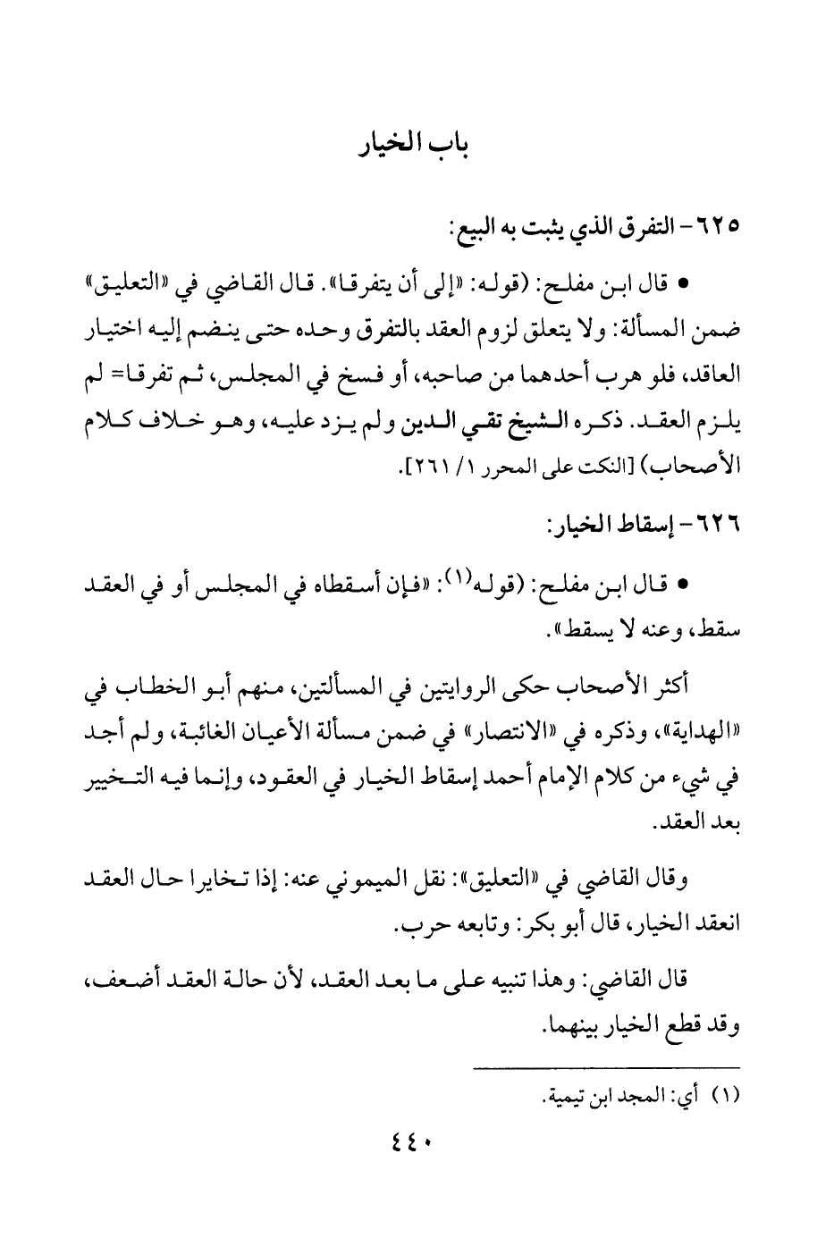 • قال ابن مفلح: (قوله: "إلى أن يتفرقا". قال القاضي في "التعليق" ضمن المسألة: ولا يتعلق لزوم العقد بالتفرق وحده حتى ينضم إليه اختيار العاقد، فلو هرب أحدهما من صاحبه، أو فسخ في المجلس، ثم تفرقا = لم يلزم العقد. ذكره الشيخ تقي الدين ولم يزد عليه، وهو خلاف كلام الأصحاب) [النكت على المحرر 1/ 261].