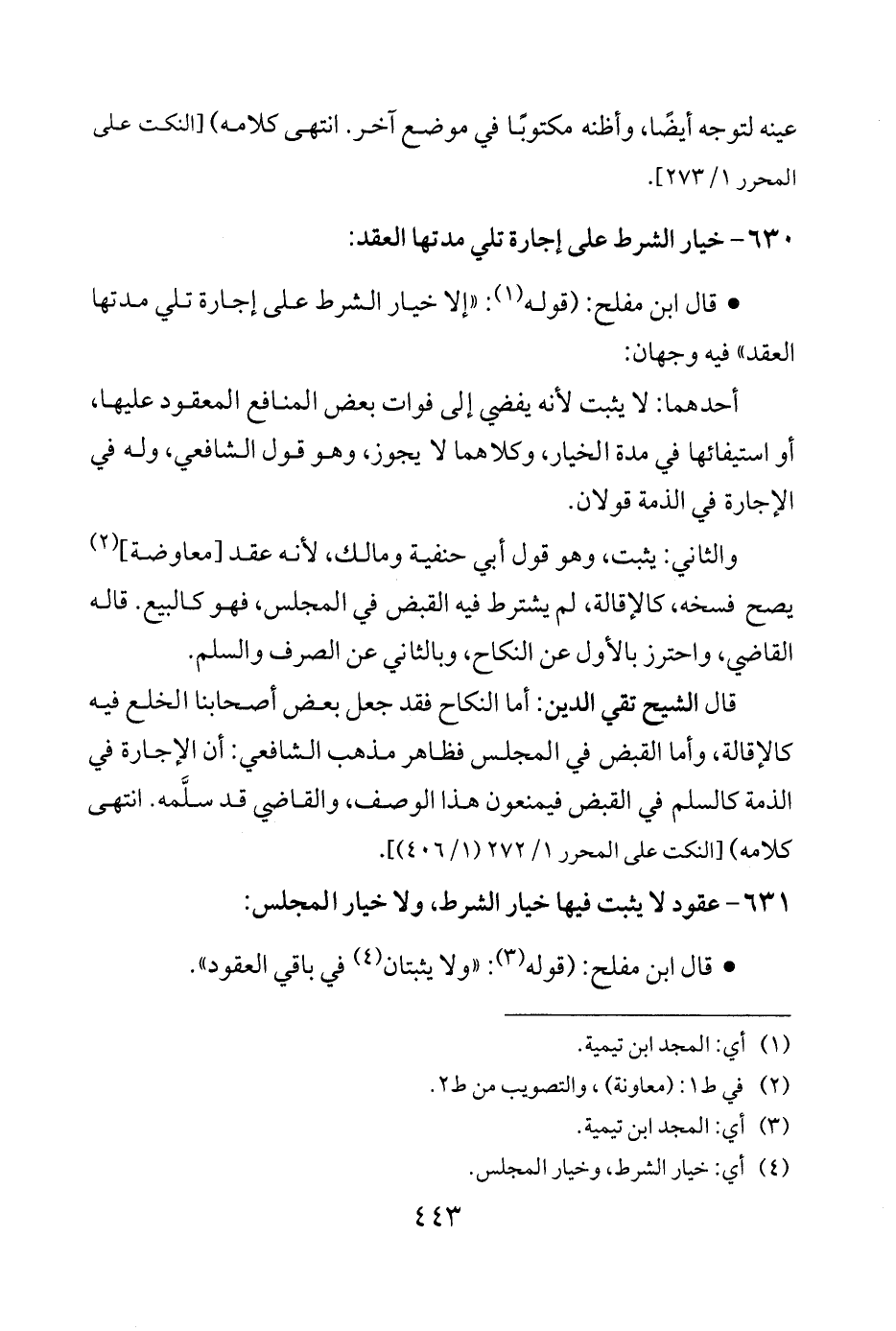 • قال ابن مفلح: (قوله (¬1): "إلا خيار الشرط على إجارة تلي مدتها العقد" فيه وجهان: