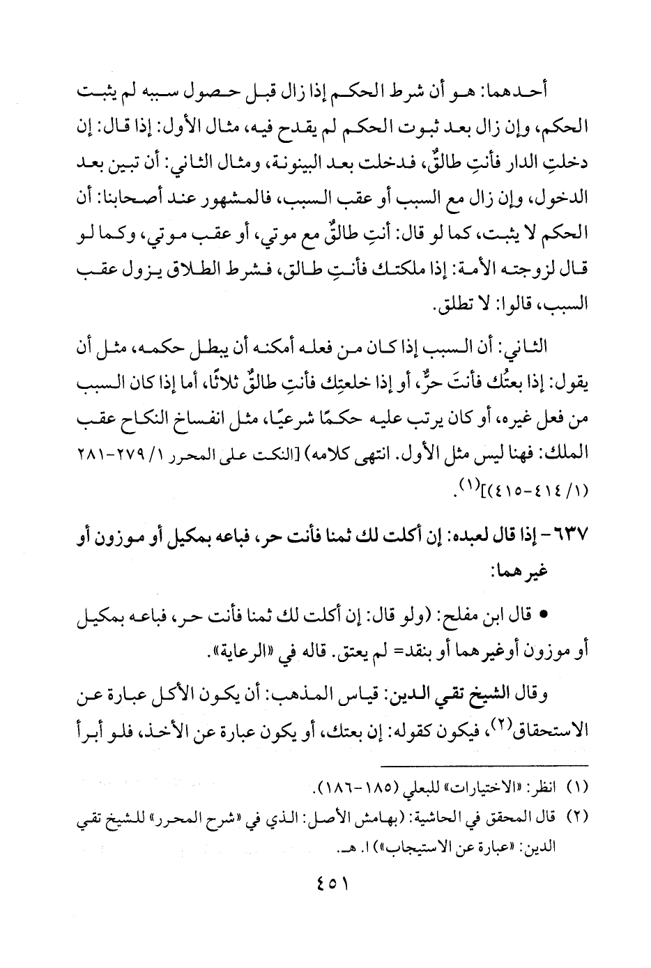 الثاني: أن السبب إذا كان من فعله أمكنه أن يبطل حكمه، مثل أن يقول: إذا بعتُك فأنتَ حرّ، أو إذا خلعتِك فأنتِ طالق ثلاثًا، أما إذا كان السبب من فعل غيره، أو كان يرتب عليه حكمًا شرعيا، مثل انفساخ النكاح عقب الملك: فهنا ليس مثل الأول. انتهى كلامه) [النكت على المحرر 1/ 279 - 281 (1/ 414 - 415)] (¬1).