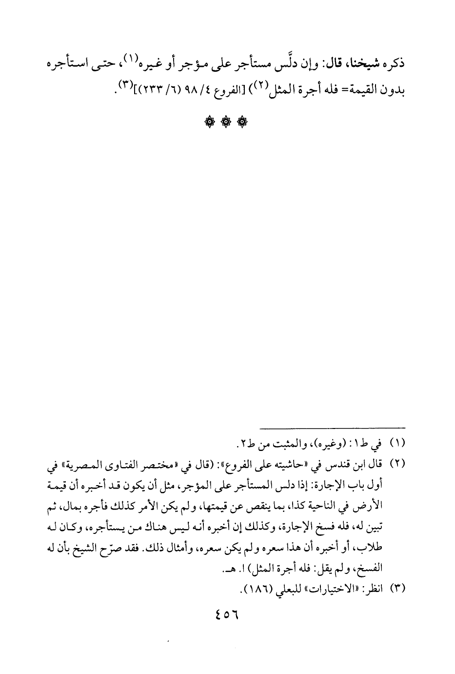 (¬2) قال ابن قندس في "حاشيته على الفروع": (قال في "مختصر الفتاوى المصرية" في أول باب الإجارة: إذا دلس المستأجر على المؤجر، مثل أن يكون قد أخبره أن قيمة الأرض في الناحية كذا، بما ينقص عن قيمتها، ولم يكن الأمر كذلك فأجره بمال، ثم تبين له، فله فسخ الإجارة، وكذلك إن أخبره أنه ليس هناك من يستأجره، وكان له طلاب، أو أخبره أن هذا سعره ولم يكن سعره، وأمثال ذلك. فقد صرّح الشيخ بأن له الفسخ، ولم يقل: فله أجرة المثل) ا. هـ.