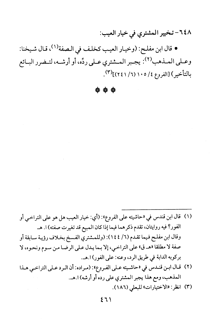 (¬2) قال ابن قندس في "حاشيته على الفروع": (مراده: أن الرد على التراخي هذا المذهب، ومع هذا يجبر المشتري على رده أو أرشه) ا. هـ.