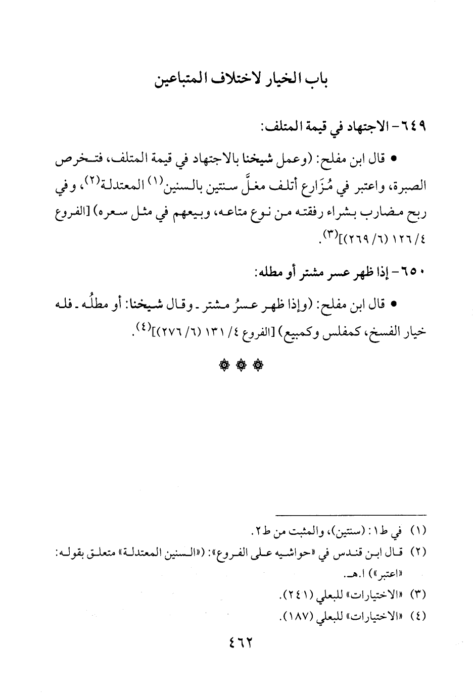 • قال ابن مفلح: (وإذا ظهر عسرُ مشتر -وقال شيخنا: أو مطلُه- فله خيار الفسخ، كمفلس وكمبيع) [الفروع 4/ 131 (6/ 276)] (¬4).