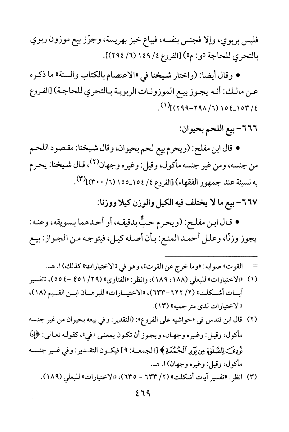 • قال ابن مفلح: (ويحرم بيع لحم بحيوان، وقال شيخنا: مقصود اللحم من جنسه، ومن غير جنسه مأكول، وقيل: وغيره وجهان (¬2)] قال شيخنا: يحرم به نسيئة عند جمهور الفقهاء) [الفروع 4/ 154 - 155 (6/ 300)] (¬3).