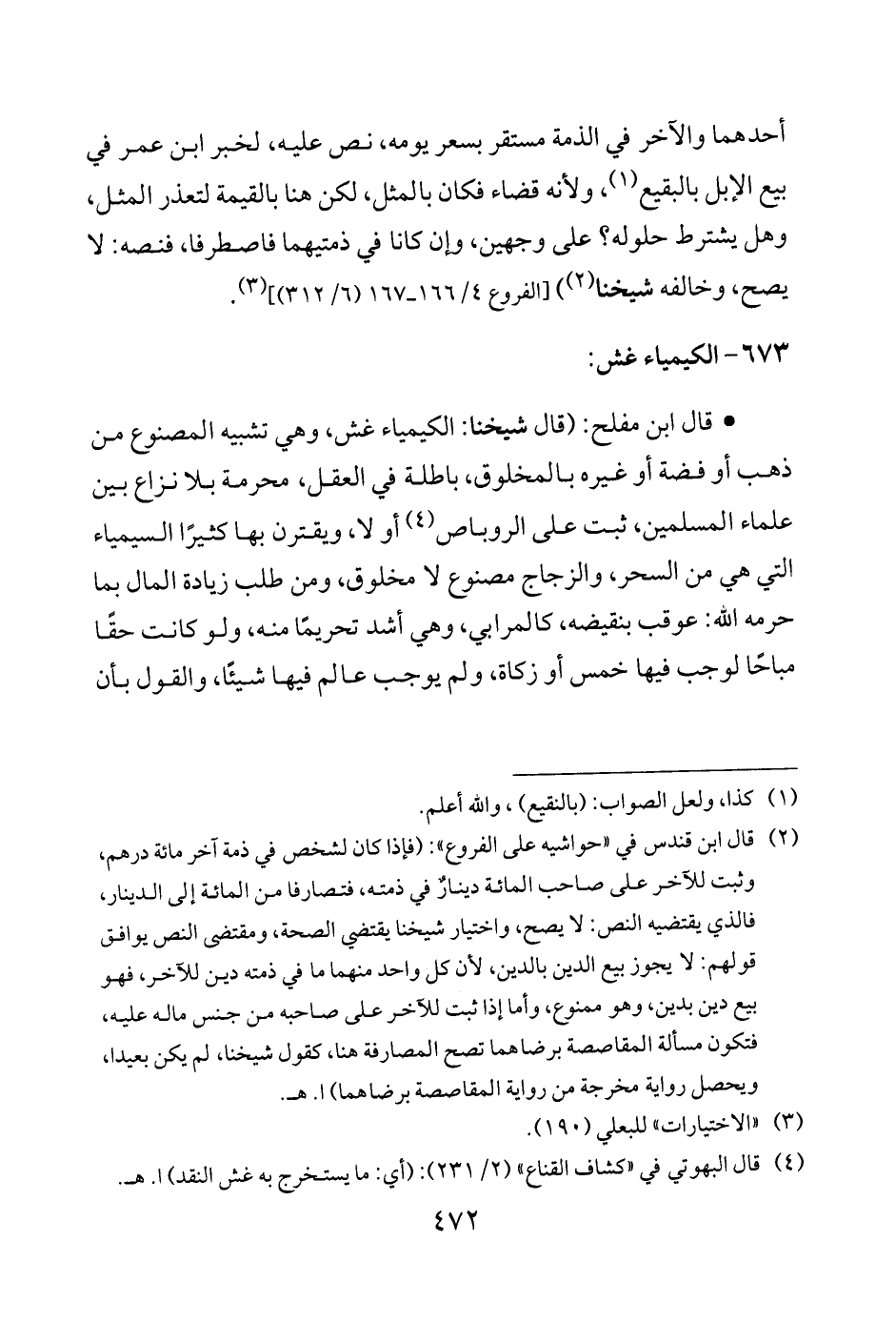 • قال ابن مفلح: (قال شيخنا: الكيمياء غش، وهي تشبيه المصنوع من ذهب أو فضة أو غيره بالمخلوق، باطلة في العقل، محرمة بلا نزاع بين علماء المسلمين، ثبت على الروباص (¬4) أو لا، ويقترن بها كثيرًا السيمياء التي هي من السحر، والزجاج مصنوع لا مخلوق، ومن طلب زيادة المال بما حرمه الله: عوقب بنقيضه، كالمرابي، وهي أشد تحريمًا منه، ولو كانت حقا مباحًا لوجب فيها خمس أو زكاة، ولم يوجب عالم فيها شيئًا، والقول بأن
