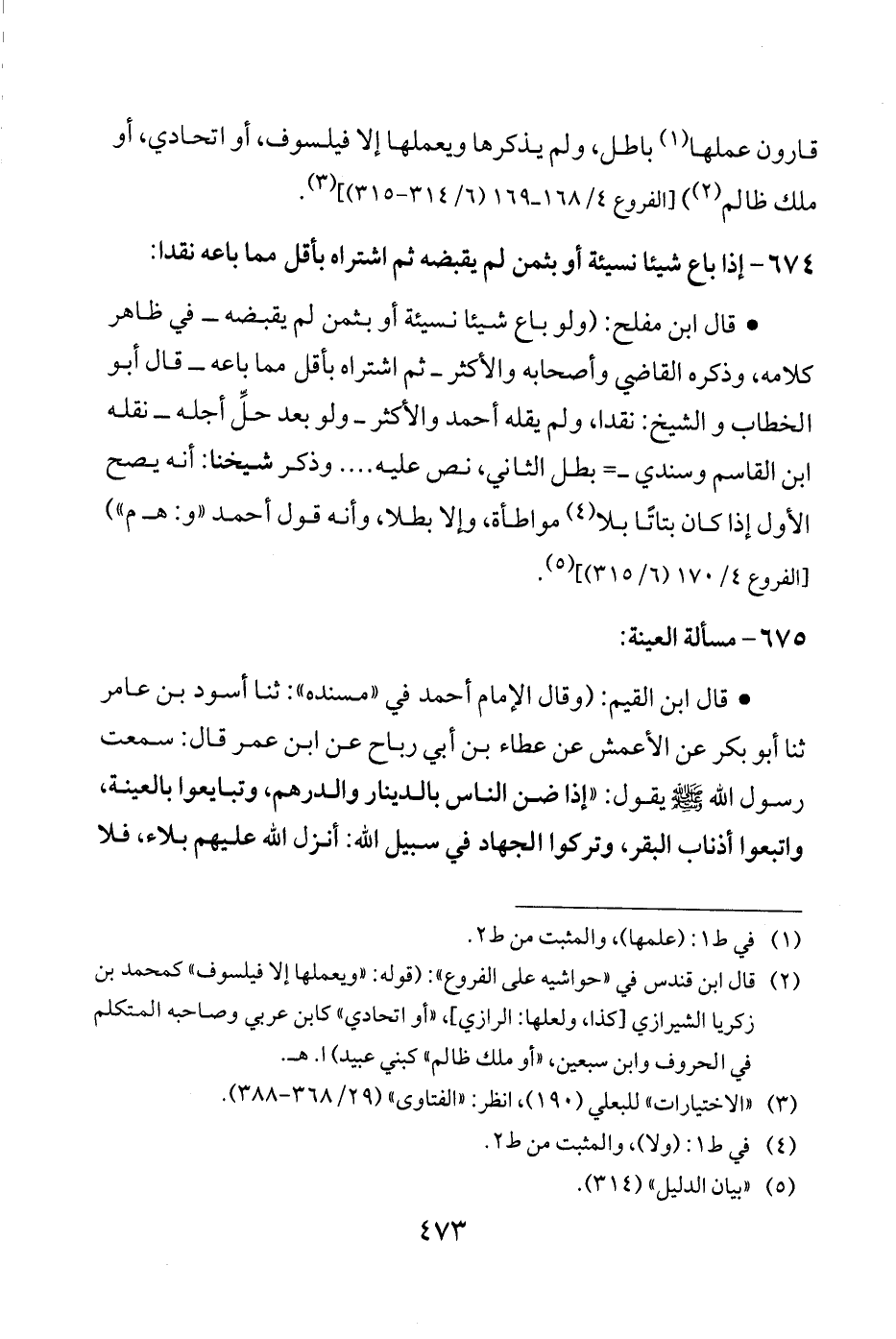 • قال ابن القيم: (وقال الإمام أحمد في "مسنده": ثنا أسود بن عامر ثنا أبو بكر عن الأعمش عن عطاء بن أبي رباح عن ابن عمر قال: سمعت رسول الله - صلى الله عليه وسلم - يقول: "إذا ضن الناس بالدينار والدرهم، وتبايعوا بالعينة، واتبعوا أذناب البقر، وتركوا الجهاد في سبيل الله: أنزل الله عليهم بلاء، فلا
