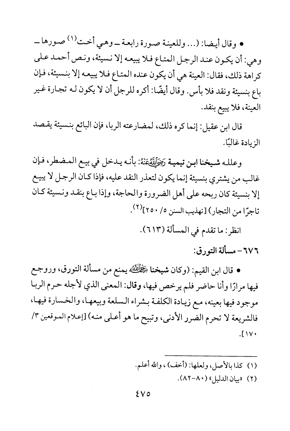 • قال ابن القيم: (وكان شيخنا رحمه الله يمنع من مسألة التورق، وروجع فيها مرارًا وأنا حاضر فلم يرخص فيها، وقال: المعنى الذي لأجله حرم الربا موجود فيها بعينه، مع زيادة الكلفة بشراء السلعة وبيعها، والخسارة فيها، فالشريعة لا تحرم الضرر الأدنى، وتبيح ما هو أعلى منه) [إعلام الموقعين 3/ 175].