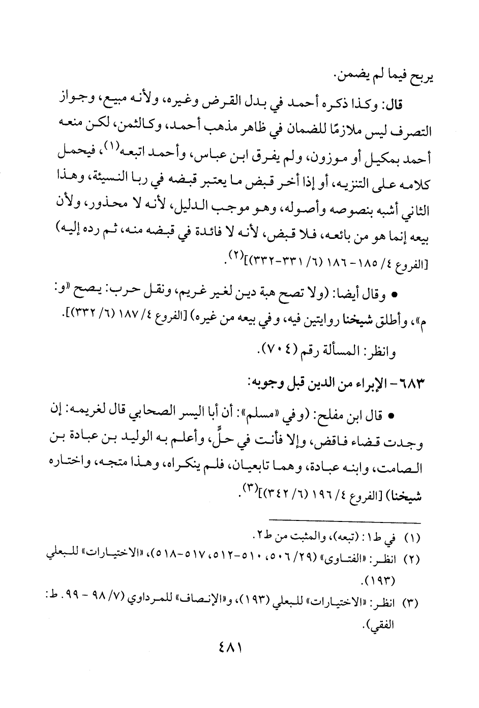 قال: وكذا ذكره أحمد في بدل القرض وغيره، ولأنه مبيع، وجواز التصرف ليس ملازمًا للضمان في ظاهر مذهب أحمد، وكالثمن، لكن منعه أحمد بمكيل أو موزون، ولم يفرق ابن عباس، وأحمد اتبعه (¬1) فيحمل كلامه على التنزيه، أو إذا أخر قبض ما يعتبر قبضه في ربا النسيئة، وهذا الثاني أشبه بنصوصه وأصوله، وهو موجب الدليل، لأنه لا محذور، ولأن بيعه إنما هو من بائعه، فلا قبض، لأنه لا فائدة في قبضه منه، ثم رده إليه) [الفروع 4/ 185 - 186 (6/ 331 - 332)] (¬2).