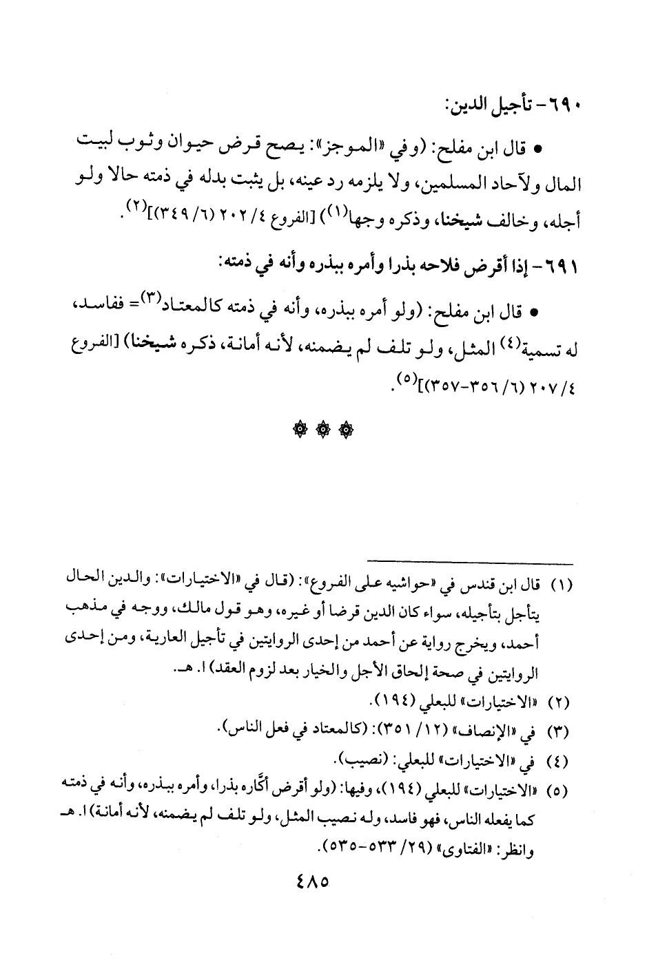 (¬1) قال ابن قندس في "حواشيه على الفروع": (قال في "الاختيارات": والدين الحال يتأجل بتأجيله، سواء كان الدين قرضا أو غيره، وهو قول مالك، ووجه في مذهب أحمد، ويخرج رواية عن أحمد من إحدى الروايتين في تأجيل العارية، ومن إحدى الروايتين في صحة إلحاق الأجل والخيار بعد لزوم العقد) ا. هـ.