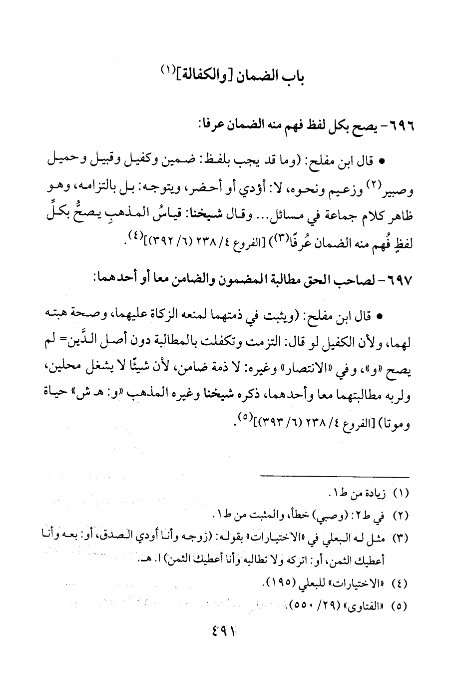 • قال ابن مفلح: (ويثبت في ذمتهما لمنعه الزكاة عليهما، وصحة هبته لهما، ولأن الكفيل لو قال: التزمت وتكفلت بالمطالبة دون أصل الدَّين = لم يصح "و"، وفي "الانتصار" وغيره: لا ذمة ضامن، لأن شيئًا لا يشغل محلين، ولربه مطالبتهما معا وأحدهما، ذكره شيخنا وغيره المذهب "و: هـ ش" حياة وموتا) [الفروع 4/ 238 (6/ 393)] (¬5).
