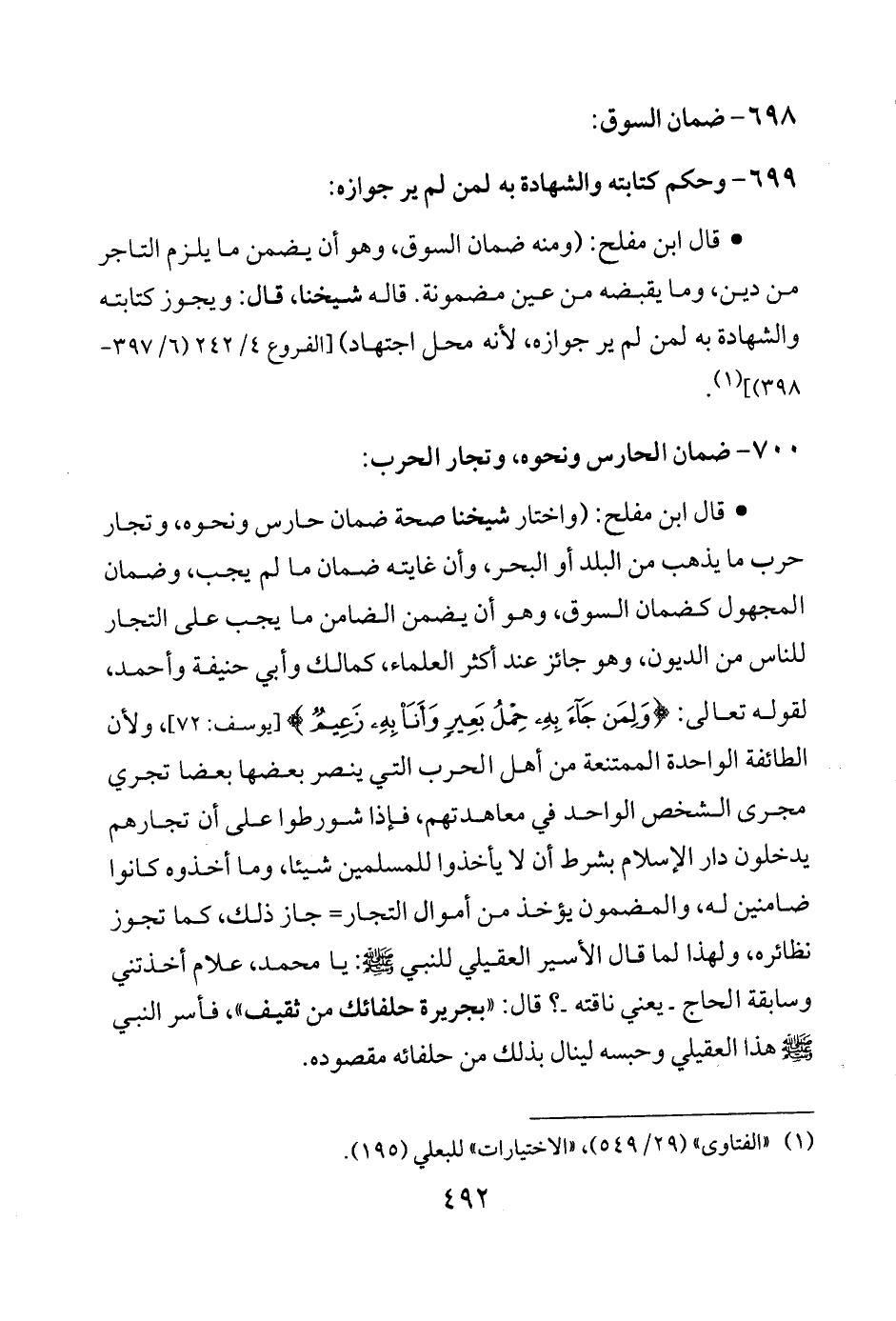 • قال ابن مفلح: (واختار شيخنا صحة ضمان حارس ونحوه، وتجار حرب ما يذهب من البلد أو البحر، وأن غايته ضمان ما لم يجب، وضمان المجهول كضمان السوق، وهو أن يضمن الضامن ما يجب على التجار للناس من الديون، وهو جائز عند أكثر العلماء، كمالك وأبي حنيفة وأحمد، لقوله تعالى: {وَلِمَنْ جَاءَ بِهِ حِمْلُ بَعِيرٍ وَأَنَا بِهِ زَعِيمٌ} [يوسف: 72]، ولأن الطائفة الواحدة المتنعة من أهل الحرب التي ينصر بعضها بعضا تجري مجرى الشخص الواحد في معاهدتهم، فإذا شورطوا على أن تجارهم يدخلون دار الإسلام بشرط أن لا يأخذوا للمسلمين شيئًا، وما أخذوه كانوا ضامنين له، والمضمون يؤخذ من أموال التجار = جاز ذلك، كما تجوز نظائره، ولهذا لما قال الأسير العقيلي للنبي - صلى الله عليه وسلم -: يا محمد، علام أخذتني وسابقة الحاج -يعني ناقته-؟ قال: "بجريرة حلفائك من ثقيف"، فأسر النبي - صلى الله عليه وسلم - هذا العقيلي وحبسه لينال بذلك من حلفائه مقصوده.