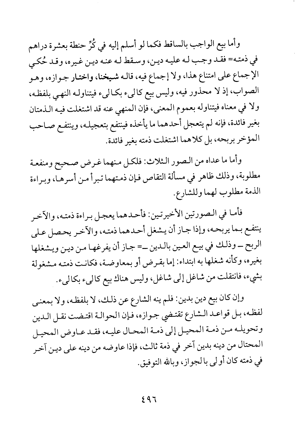 وأما بيع الواجب بالساقط فكما لو أسلم إليه في كُرِّ حنطة بعشرة دراهم في ذمته = فقد وجب له عليه دين، وسقط له عنه دين غيره، وقد حُكي الإجماع على امتناع هذا، ولا إجماع فيه، قاله شيخنا، واختار جوازه، وهو الصواب، إذ لا محذور فيه، وليس بيع كالئ بكالئ فيتناوله النهي بلفظه، ولا في معناه فيتناوله بعموم المعنى، فإن المنهي عنه قد اشتغلت فيه الذمتان بغير فائدة، فإنه لم يتعجل أحدهما ما يأخذه فينتفع بتعجيله، وينتفع صاحب المؤخر بربحه، بل كلاهما اشتغلت ذمته بغير فائدة.