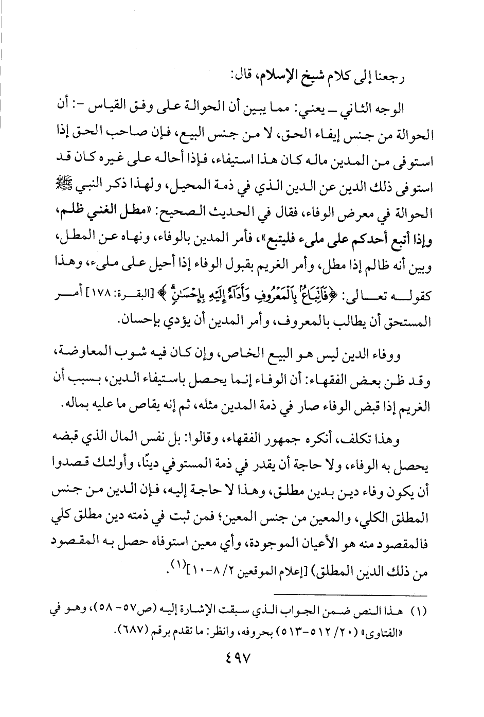 الوجه الثاني -يعني: مما يبين أن الحوالة على وفق القياس-: أن الحوالة من جنس إيفاء الحق، لا من جنس البيع، فإن صاحب الحق إذا استوفى من المدين ماله كان هذا استيفاء، فإذا أحاله على غيره كان قد استوفى ذلك الدين عن الدين الذي في ذمة المحيل، ولهذا ذكر النبي - صلى الله عليه وسلم - الحوالة في معرض الوفاء، فقال في الحديث الصحيح: "مطل الغني ظلم، وإذا أتبع أحدكم على ملئ فليتبع"، فأمر المدين بالوفاء، ونهاه عن المطل، وبين أنه ظالم إذا مطل، وأمر الغريم بقبول الوفاء إذا أحيل على ملئ، وهذا كقوله تعالى: {فَاتِّبَاعٌ بِالْمَعْرُوفِ وَأَدَاءٌ إِلَيهِ بِإِحْسَانٍ} [البقرة: 178] أمر المستحق أن يطالب بالمعروف، وأمر المدين أن يؤدي بإحسان.