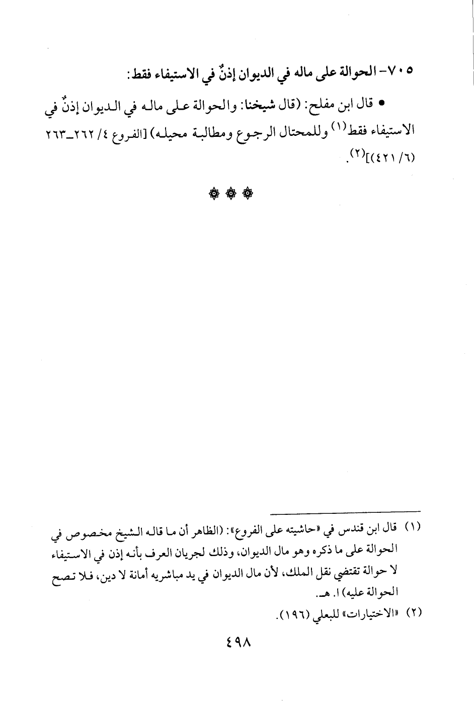 • قال ابن مفلح: (قال شيخنا: والحوالة على ماله في الديوان إذنٌ في الاستيفاء فقط (¬1) وللمحتال الرجوع ومطالبة محيله) [الفروع 4/ 262 - 263 (6/ 421)] (¬2).