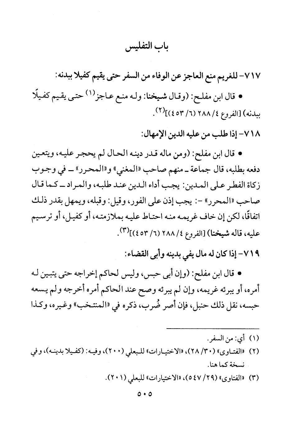 • قال ابن مفلح: (وقال شيخنا: وله منع عاجز (¬1) حتى يقيم كفيلًا ببدنه) [الفروع 4/ 288 (6/ 453)] (¬2).