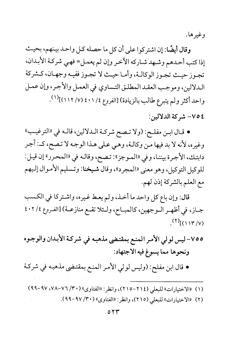 • قال ابن مفلح: (ولا تصح شركة الدلالين، قاله في "الترغيب" وغيره، لأنه لا بد فيها من وكالة، وهي على هذا الوجه لا تصح، كـ: آجر دابتك، الأجرة بيننا، وفي "الموجز": تصح، وقاله في "المحرر" إن قيل: للوكيل التوكيل، وهو معنى "المجرد"، وقال شيخنا: وتسليم الأموال إليهم مع العلم بالشركة إذن لهم.