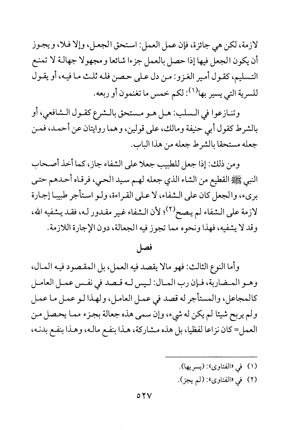 وأما النوع الثالث: فهو ما لا يقصد فيه العمل، بل المقصود فيه المال، وهو المضاربة، فإن رب المال: ليس له قصد في نفس عمل العامل كالمجاعل، والمستأجر له قصد في عمل العامل، ولهذا لو عمل ما عمل ولم يربح شيئًا لم يكن له شيء، وإن سمى هذه جعالة بجزء مما يحصل من العمل = كان نزاعا لفظيا، بل هذه مشاركة، هذا بنفع ماله، وهذا بنفع بدنه،