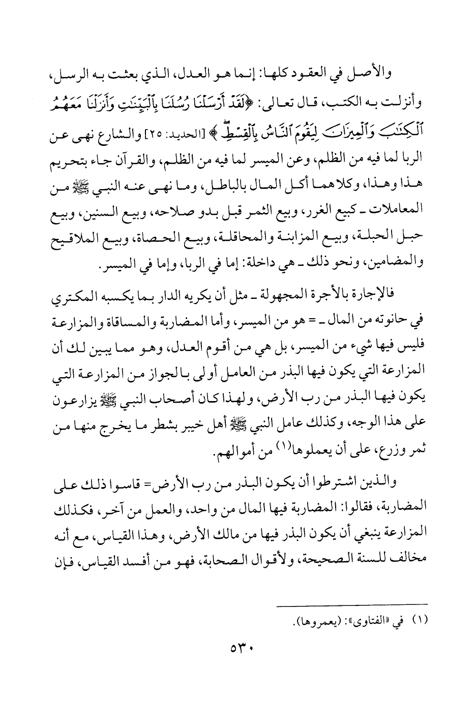 والأصل في العقود كلها: إنما هو العدل، الذي بعثت به الرسل، وأنزلت به الكتب، قال تعالى: {لَقَدْ أَرْسَلْنَا رُسُلَنَا بِالْبَيِّنَاتِ وَأَنْزَلْنَا مَعَهُمُ الْكِتَابَ وَالْمِيزَانَ لِيَقُومَ النَّاسُ بِالْقِسْطِ} [الحديد: 25] والشارع نهى عن الربا لما فيه من الظلم، وعن الميسر لما فيه من الظلم، والقرآن جاء بتحريم هذا وهذا، وكلاهما أكل المال بالباطل، وما نهى عنه النبي - صلى الله عليه وسلم - من المعاملات -كبيع الغرر، وبيع الثمر قبل بدو صلاحه، وبيع السنين، وبيع حبل الحبلة، وبيع المزابنة والمحاقلة، وبيع الحصاة، وبيع الملاقيح والمضامين، ونحو ذلك- هي داخلة: إما في الربا، وإما في الميسر.