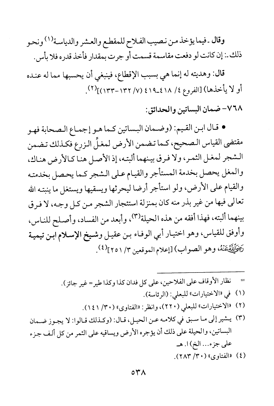 • قال ابن القيم: (وضمان البساتين كما هو إجماع الصحابة فهو مقتضى القياس الصحيح، كما تضمن الأرض لمغلِّ الزرع فكذلك تضمن الشجر لمغل الثمر، ولا فرق بينهما ألبته، إذ الأصل هنا كالأرض هناك، والمغل يحصل بخدمة المستأجر والقيام على الشجر كما يحصل بخدمته والقيام على الأرض، ولو استأجر أرضا ليحرثها ويسقيها ويستغل ما ينبته الله تعالى فيها من غير بذر منه كان بمنزلة استئجار الشجر من كل وجه، لا فرق بينهما ألبته، فهذا أفقه من هذه الحيلة (¬3)، وأبعد من الفساد، وأصلح للناس، وأوفق للقياس، وهو اختيار أبي الوفاء بن عقيل وشيخ الإسلام ابن تيمية - رضي الله عنه -، وهو الصواب) [إعلام الموقعين 3/ 251] (¬4).