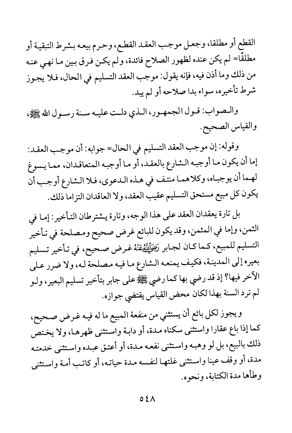 وقوله: إن موجب العقد التسليم في الحال = جوابه: أن موجب العقد: إما أن يكون ما أوجبه الشارع بالعقد، أو ما أوجبه المتعاقدان، مما يسوغ لهما أن يوجباه، وكلاهما منتف في هذه الدعوى، فلا الشارع أوجب أن يكون كل مبيع مستحق التسليم عقيب العقد، ولا العاقدان التزاما ذلك.