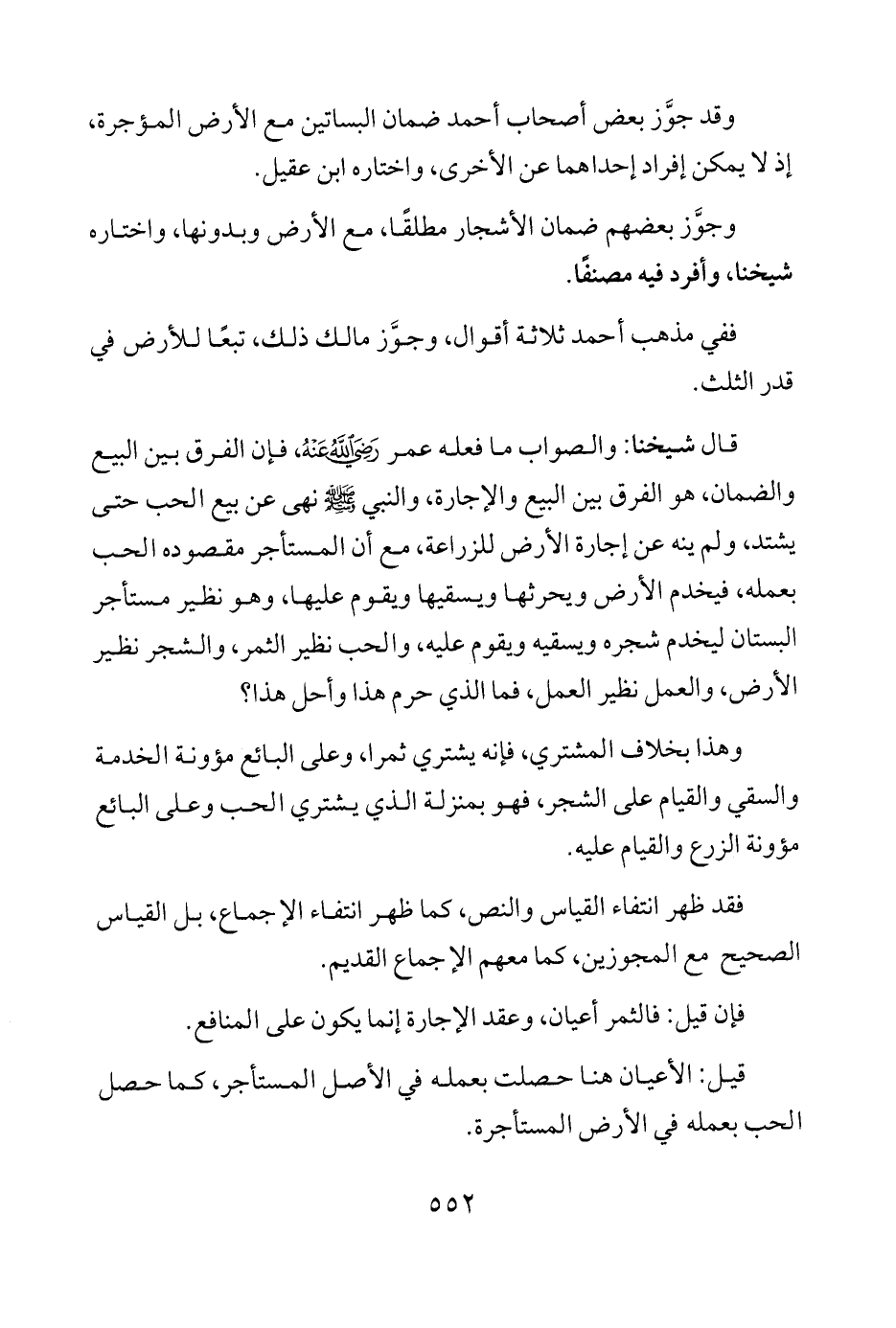 قال شيخنا: والصواب ما فعله عمر - رضي الله عنه -، فإن الفرق بين البيع والضمان، هو الفرق بين البيع والإجارة، والنبي - صلى الله عليه وسلم - نهى عن بيع الحب حتَّى يشتد" ولم ينه عن إجارة الأرض للزراعة، مع أن المستأجر مقصوده الحب بعمله، فيخدم الأرض ويحرثها ويسقيها ويقوم عليها، وهو نظير مستأجر البستان ليخدم شجره ويسقيه ويقوم عليه، والحب نظير الثمر، والشجر نظير الأرض، والعمل نظير العمل، فما الذي حرم هذا وأحل هذا؟