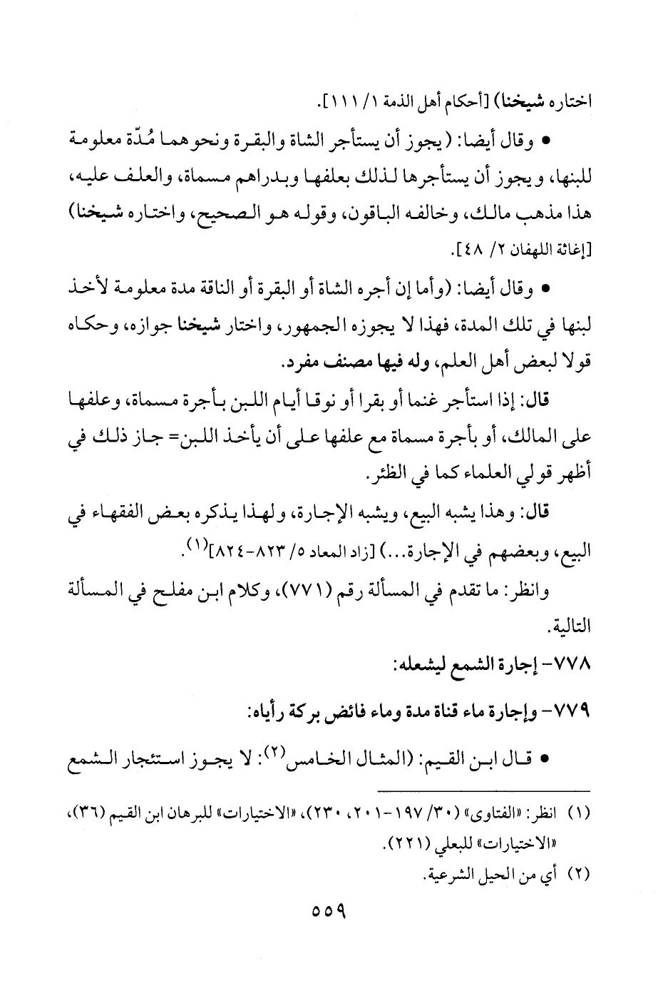 • وقال أيضًا: (يجوز أن يستأجر الشاة والبقرة ونحوهما مُدّة معلومة للبنها، ويجوز أن يستأجرها لذلك بعلفها وبدراهم مسماة، والعلف عليه، هذا مذهب مالك، وخالفه الباقون، وقوله هو الصحيح، واختاره شيخنا) [إغاثة اللهفان 2/ 48].
