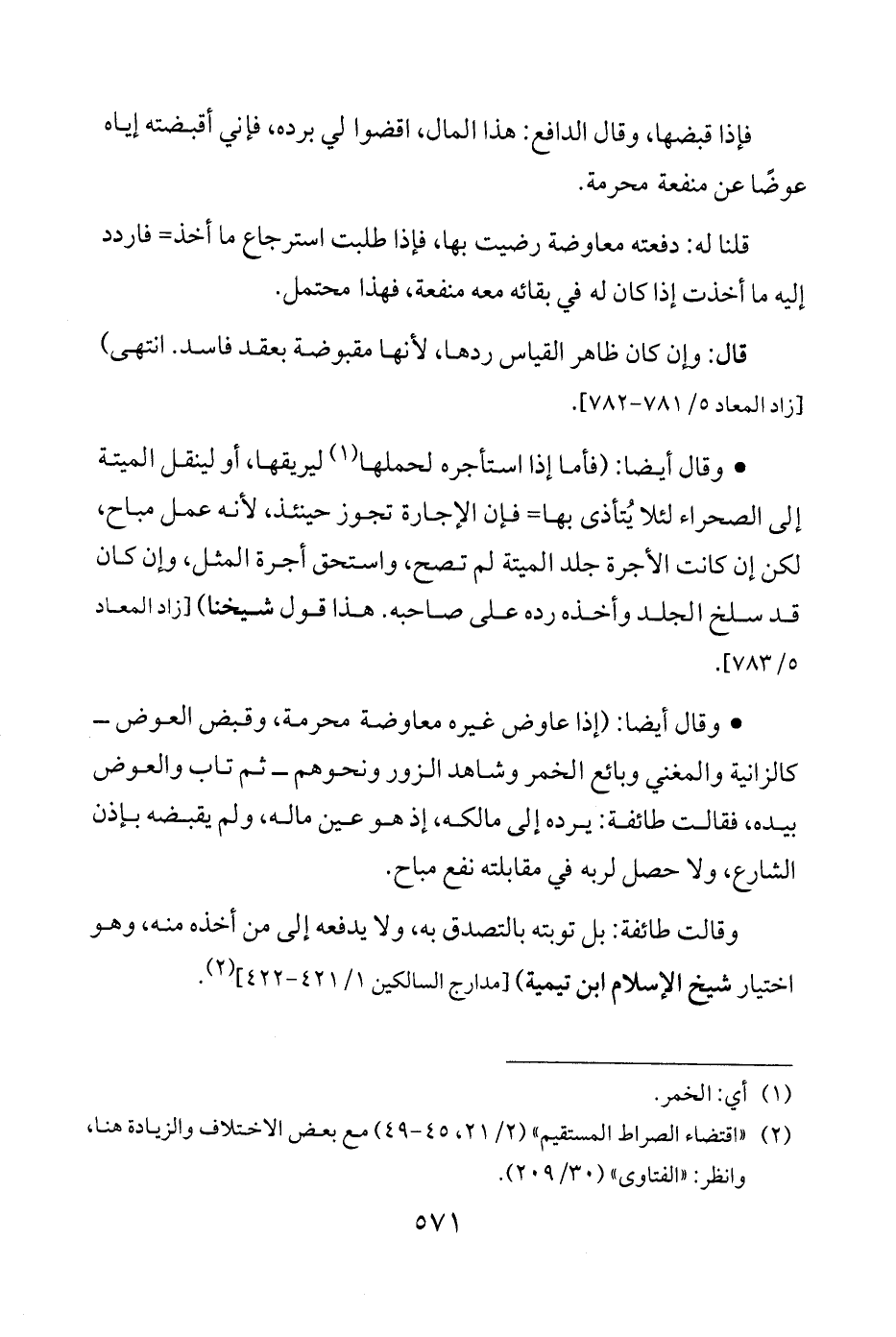 • وقال أيضًا: (إذا عاوض غيره معاوضة محرمة، وقبض العوض -كالزانية والمغني وبائع الخمر وشاهد الزور ونحوهم- ثم تاب والعوض بيده، فقالت طائفة: يرده إلى مالكه، إذ هو عين ماله، ولم يقبضه بإذن الشارع، ولا حصل لربه في مقابلته نفع مباح.