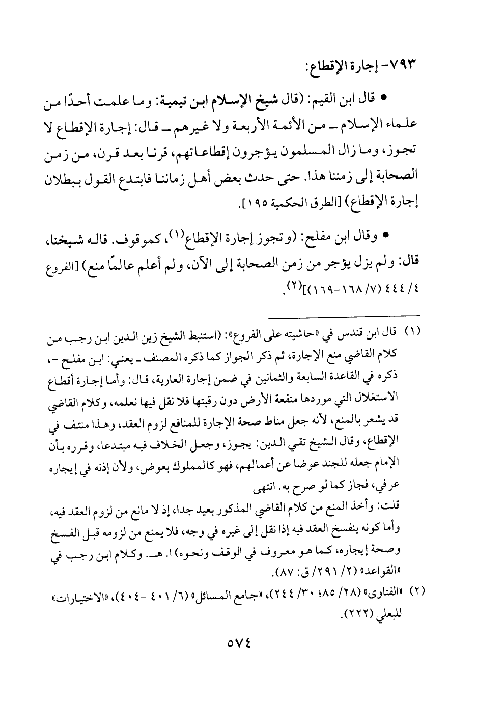 • قال ابن القيم: (قال شيخ الإسلام ابن تيمية: وما علمت أحدًا من علماء الإسلام -من الأئمة الأربعة ولا غيرهم- قال: إجارة الإقطاع لا تجوز، وما زال المسلمون يؤجرون إقطاعاتهم، قرنا بعد قرن، من زمن الصحابة إلى زمننا هذا. حتَّى حدث بعض أهل زماننا فابتدع القول ببطلان إجارة الإقطاع) [الطرق الحكمية 195].