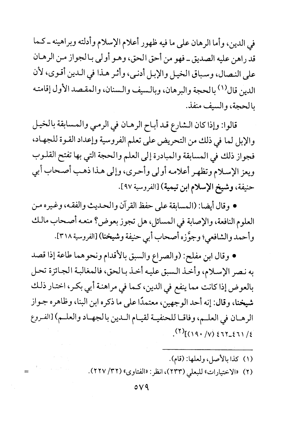 • وقال ابن مفلح: (والصراع والسبق بالأقدام ونحوهما طاعة إذا قصد به نصر الإسلام، وأخذ السبق عليه أخذ بالحقِّ، فالمغالبة الجائزة تحل بالعوض إذا كانت مما ينفع في الدين، كما في مراهنة أبي بكر، اختار ذلك شيخنا، وقال: إنه أحد الوجهين، معتمدًا على ما ذكره ابن البنا، وظاهره جواز الرهان في العلم، وفاقا للحنفية لقيام الدين بالجهاد والعلم) [الفروع 4/ 461 - 462 (7/ 190)] (¬2).