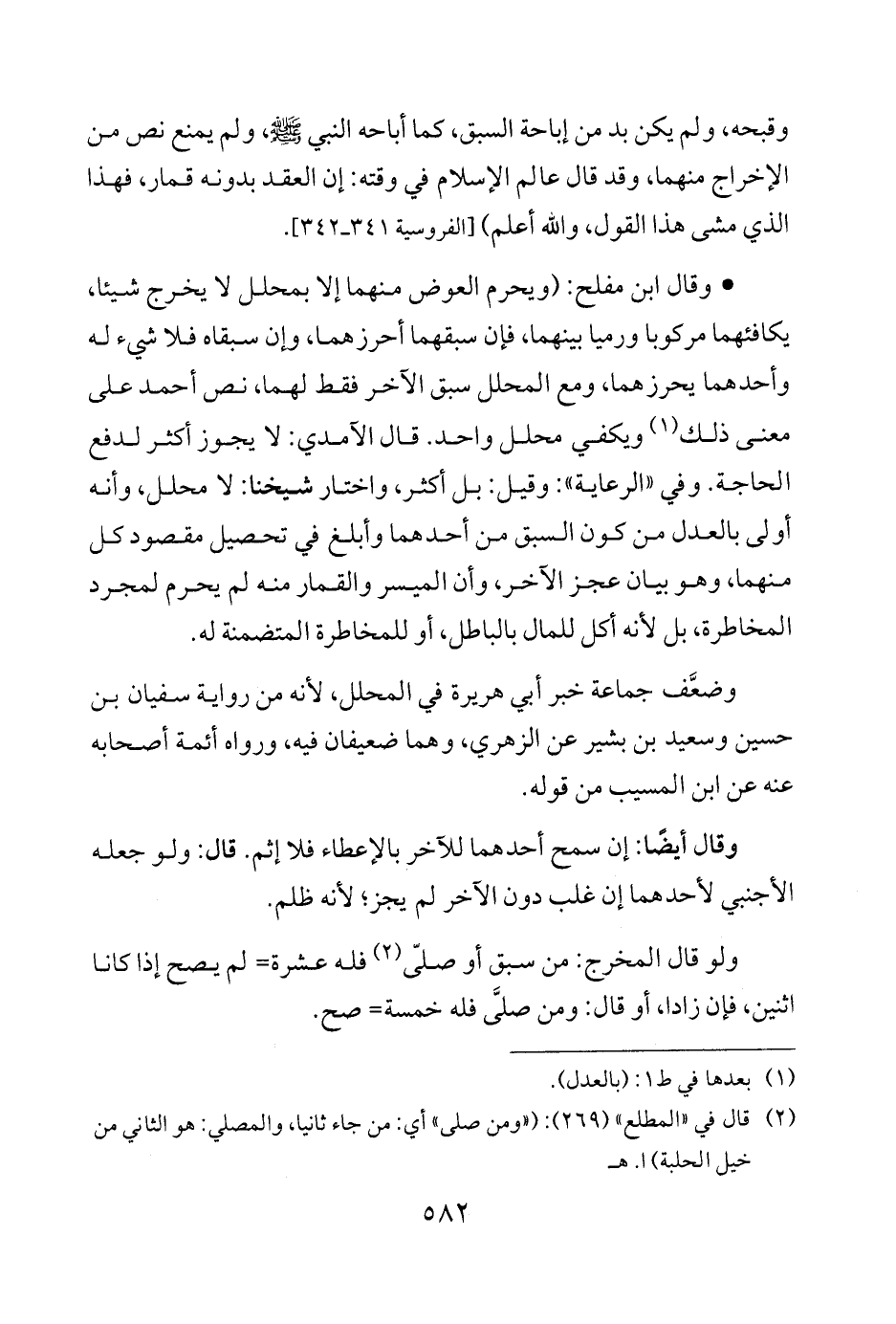 وقبحه، ولم يكن بد من إباحة السبق، كما أباحه النبي - صلى الله عليه وسلم -، ولم يمنع نص من الإخراج منهما، وقد قال عالم الإسلام في وقته: إن العقد بدونه قمار، فهذا الذي مشى هذا القول، والله أعلم) [الفروسية 341 - 342].
