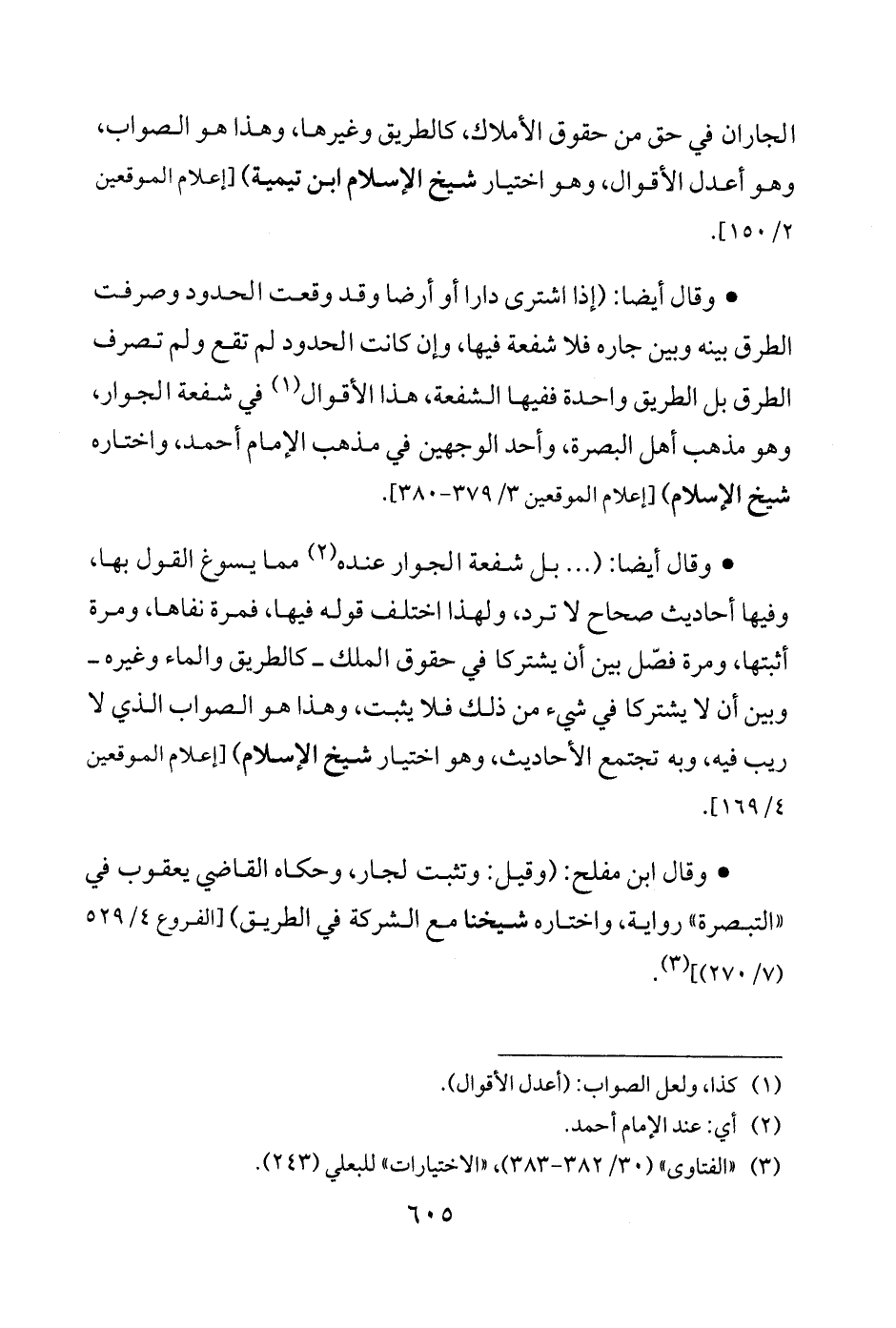 • وقال أيضًا: ( ... بل شفعة الجوار عنده (¬2) مما يسوغ القول بها، وفيها أحاديث صحاح لا ترد، ولهذا اختلف قوله فيها، فمرة نفاها، ومرة أثبتها، ومرة فصّل بين أن يشتركا في حقوق الملك -كالطريق والماء وغيره- وبين أن لا يشتركا في شيء من ذلك فلا يثبت، وهذا هو الصواب الذي لا ريب فيه، وبه تجتمع الأحاديث، وهو اختيار شيخ الإسلام) [إعلام الموقعين 4/ 169].