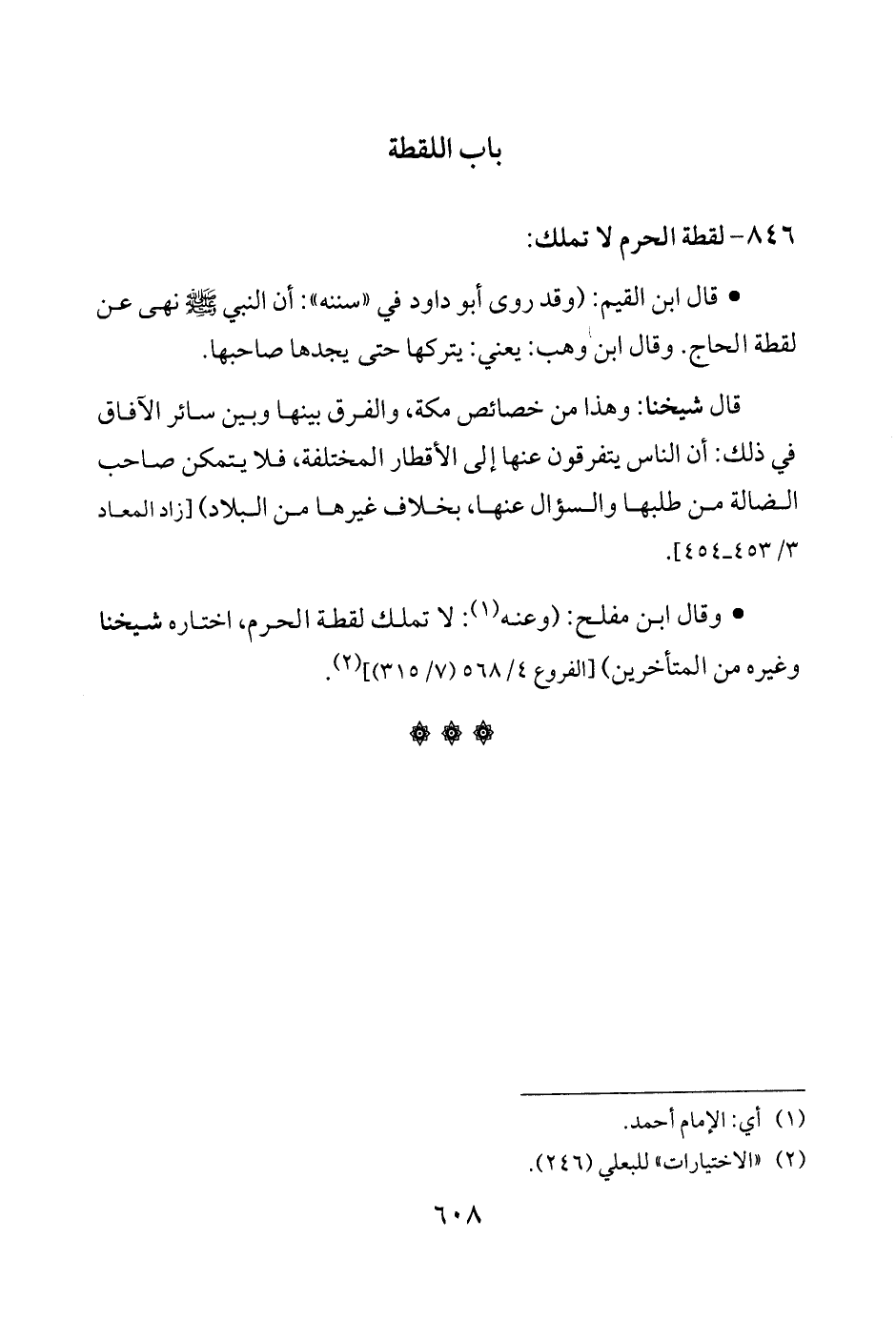 • وقال ابن مفلح: (وعنه (¬1): لا تملك لقطة الحرم، اختاره شيخنا وغيره من المتأخرين) [الفروع 4/ 568 (7/ 315)] (¬2).