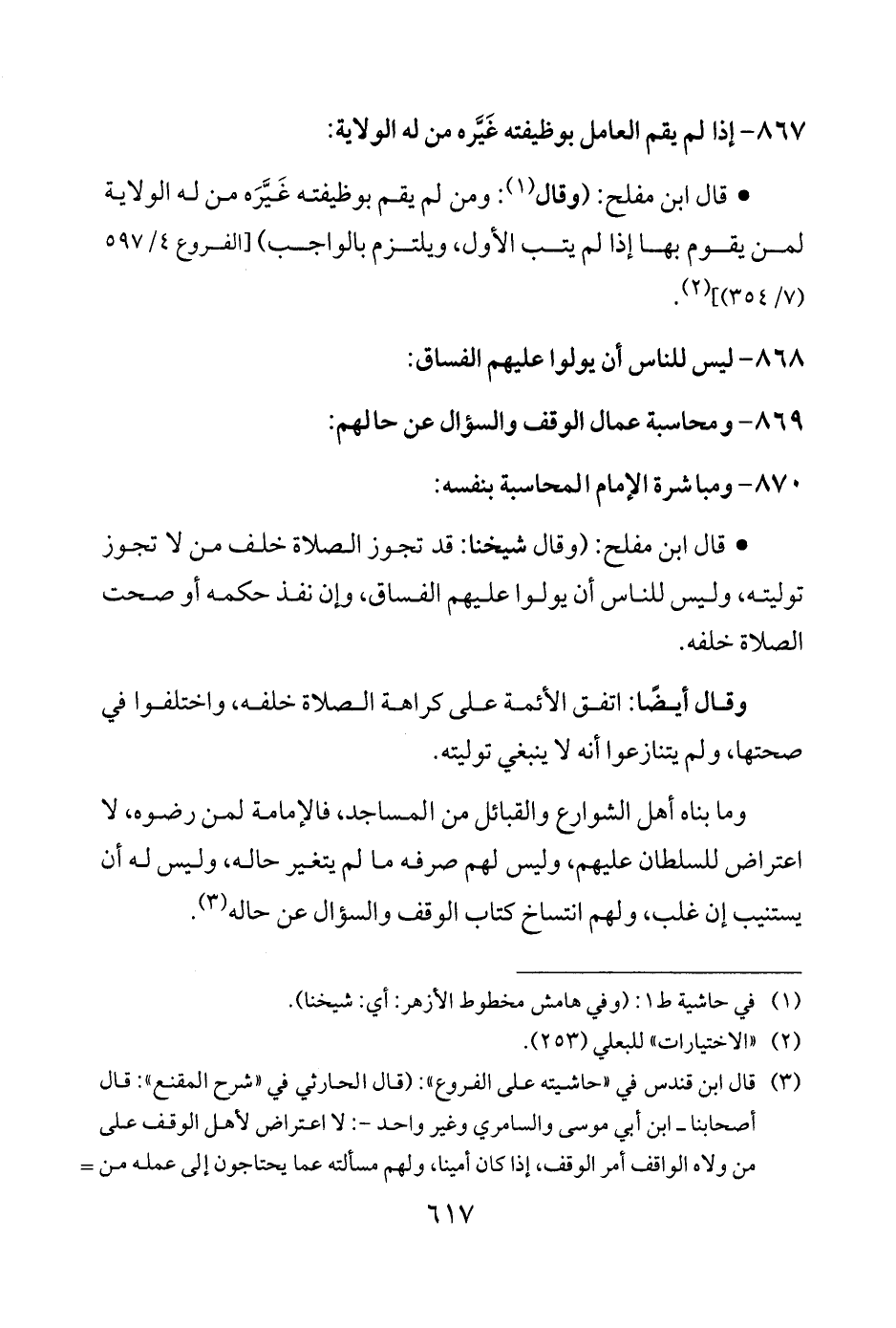 • قال ابن مفلح: (وقال شيخنا: قد تجوز الصلاة خلف من لا تجوز توليته، وليس للناس أن يولوا عليهم الفساق، وإن نفذ حكمه أو صحت الصلاة خلفه.