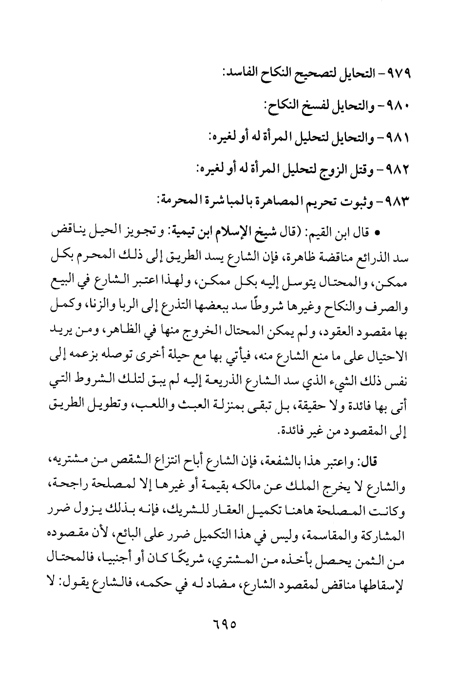 • قال ابن القيم: (قال شيخ الإِسلام ابن تيمية: وتجويز الحيل يناقض سد الذرائع مناقضة ظاهرة، فإن الشارع يسد الطريق إلى ذلك المحرم بكل ممكن، والمحتال يتوسل إليه بكل ممكن، ولهذا اعتبر الشارع في البيع والصرف والنكاح وغيرها شروطًا سد ببعضها التذرع إلى الربا والزنا، وكمل بها مقصود العقود، ولم يمكن المحتال الخروج منها في الظاهر، ومن يريد الاحتيال على ما منع الشارع منه، فيأتي بها مع حيلة أخرى توصله بزعمه إلى نفس ذلك الشيء الذي سد الشارع الذريعة إليه لم يبق لتلك الشروط التي أتى بها فائدة ولا حقيقة، بل تبقى بمنزلة العبث واللعب، وتطويل الطريق إلى المقصود من غير فائدة.