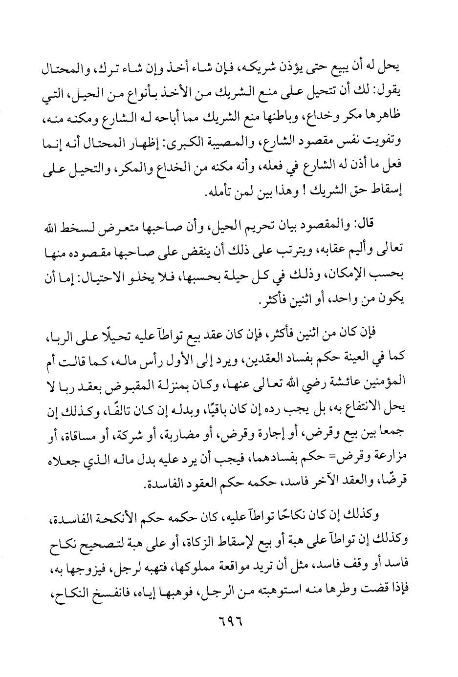 يحل له أن يبيع حتى يؤذن شريكه، فإن شاء أخذ وإن شاء ترك، والمحتال يقول: لك أن تتحيل على منع الشريك من الأخذ بأنواع من الحيل، التي ظاهرها مكر وخداع، وباطنها منع الشريك مما أباحه له الشارع ومكنه منه، وتفويت نفس مقصود الشارع، والمصيبة الكبرى: إظهار المحتال أنه إنما فعل ما أذن له الشارع في فعله، وأنه مكنه من الخداع والمكر، والتحيل على إسقاط حق الشريك! وهذا بين لمن تأمله.