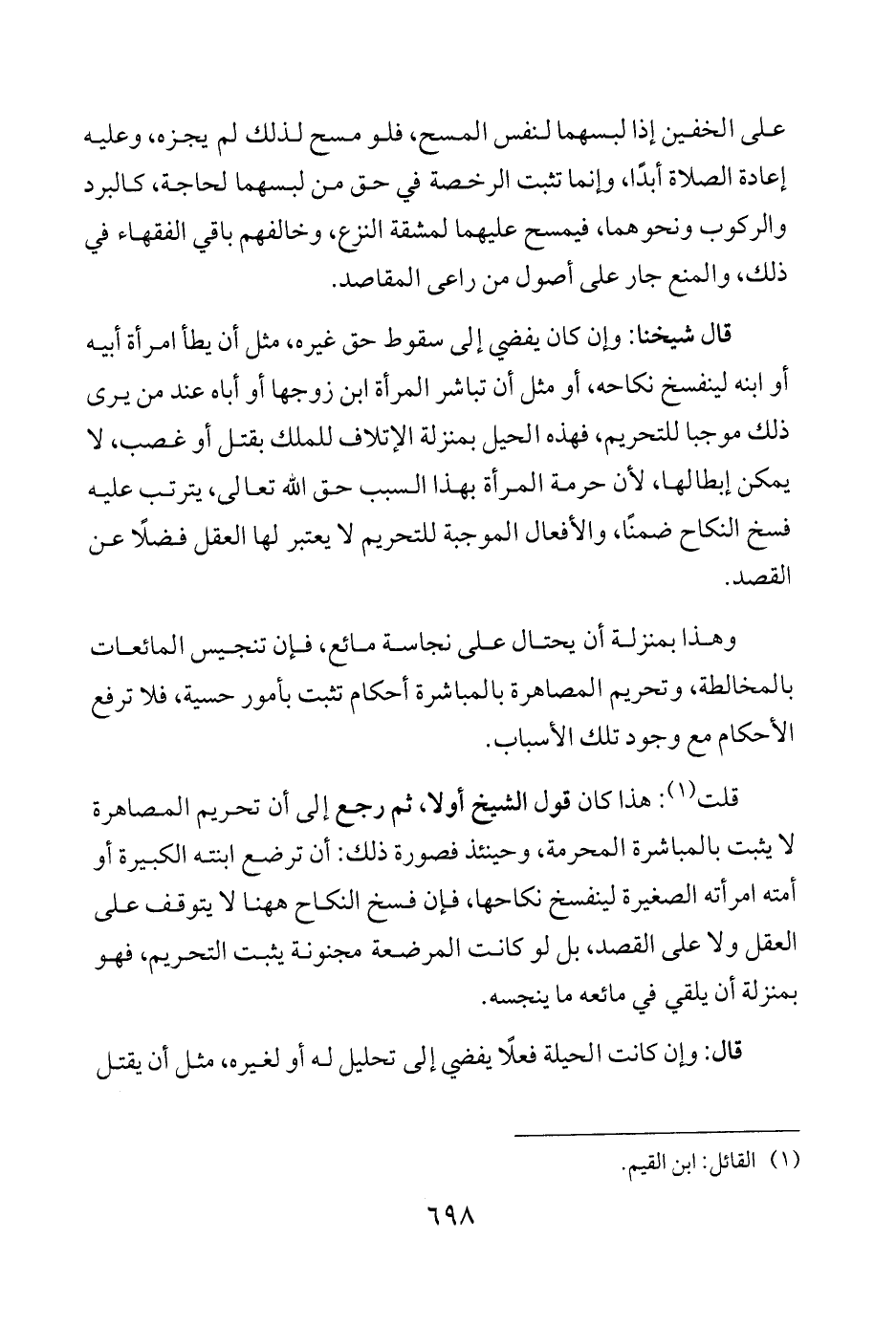 قال شيخنا: وإن كان يفضي إلى سقوط حق غيره، مثل أن يطأ امرأة أبيه أو ابنه لينفسخ نكاحه، أو مثل أن تباشر المرأة ابن زوجها أو أباه عند من يرى ذلك موجبا للتحريم، فهذه الحيل بمنزلة الإتلاف للملك بقتل أو غصب، لا يمكن إبطالها, لأن حرمة المرأة بهذا السبب حق الله تعالى، يترتب عليه فسخ النكاح ضمنًا، والأفعال الموجبة للتحريم لا يعتبر لها العقل فضلًا عن القصد.