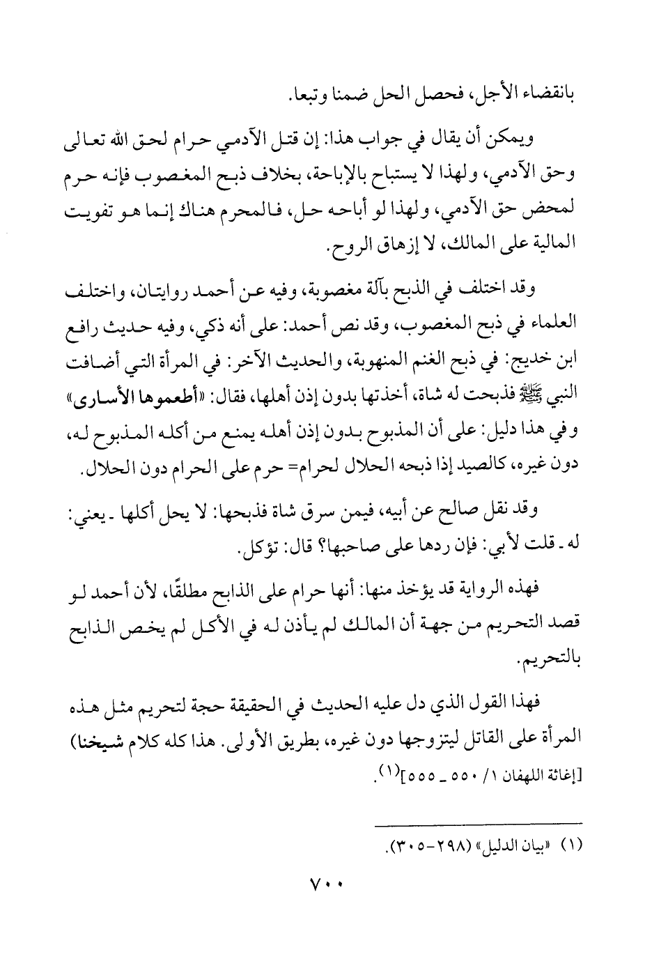 وقد اختلف في الذبح بآلة مغصوبة، وفيه عن أحمد روايتان، واختلف العلماء في ذبح المغصوب، وقد نص أحمد: على أنه ذكي، وفيه حديث رافع بن خديج: في ذبح الغنم المنهوبة، والحديث الآخر: في المرأة التي أضافت النبي - صلى الله عليه وسلم - فذبحت له شاة، أخذتها بدون إذن أهلها، فقال: "أطعموها الأسارى" وفي هذا دليل: على أن المذبوح بدون إذن أهله يمنع من أكله المذبوح له، دون غيره، كالصيد إذا ذبحه الحلال لحرام = حرم على الحرام دون الحلال.