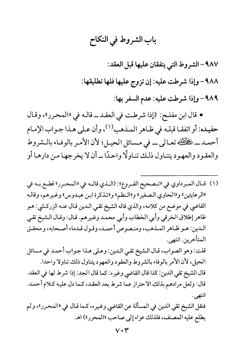 (¬1) قال المرداوي في "تصحيح الفروع": (الذي قاله في "المحرر" قطع به في "الرعايتين" و "الحاوي الصغير" و "النظم" و "تذكرة ابن عبدوس" وغيرهم، وقاله القاضي في موضع من كلامه، والذي قاله الشيخ تقي الدين قال عنه الزركشي: هو ظاهر إطلاق الخرقي وأبي الخطاب وأبي محمد وغيرهم. قال: وقال الشيخ تقي الدين: هو ظاهر المذهب، ومنصوص أحمد، وقول قدماء أصحابه، ومحقق المتأخرين. انتهى.